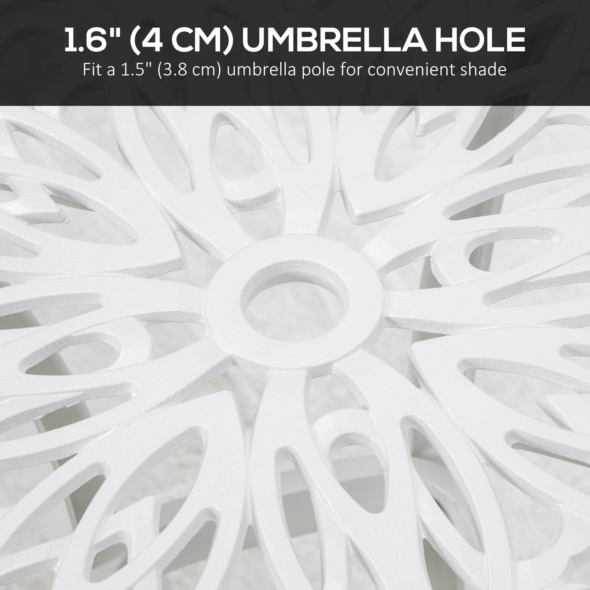Enhance your outdoor with this Outsunny bistro table. Comes with a floral cut-out tabletop with curved legs for a beautiful design. Made from cast aluminium frame, with a powder coated finish, this is a strong outdoor coffee table suitable for year-round year. Comes with a Ф3.55 cm central hole to hold parasol in place.