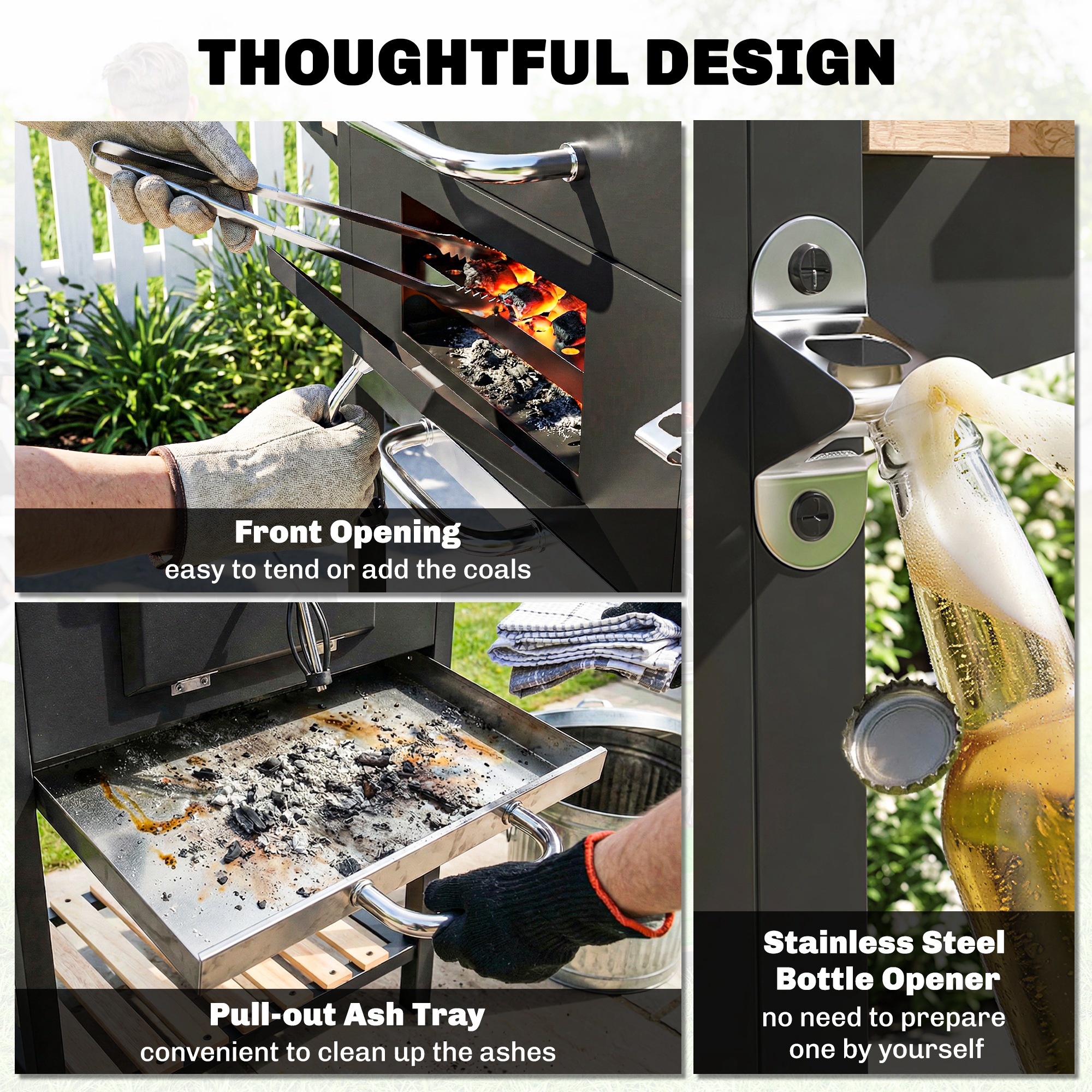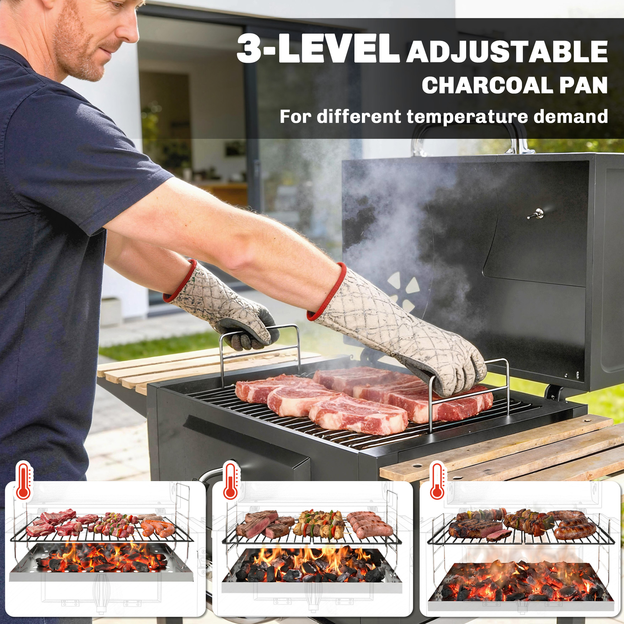 Fire up the fun with the Outsunny Charcoal Grill – your essential companion for sizzling, flavour-packed cookouts! Featuring a spacious grilling area, it effortlessly cooks up to six burger patties and sausages at once. Take control of your BBQ experience with a 3-level adjustable charcoal pan and a built-in thermometer, ensuring precision heat management for perfectly grilled delights every time. Get ready to grill like a pro!