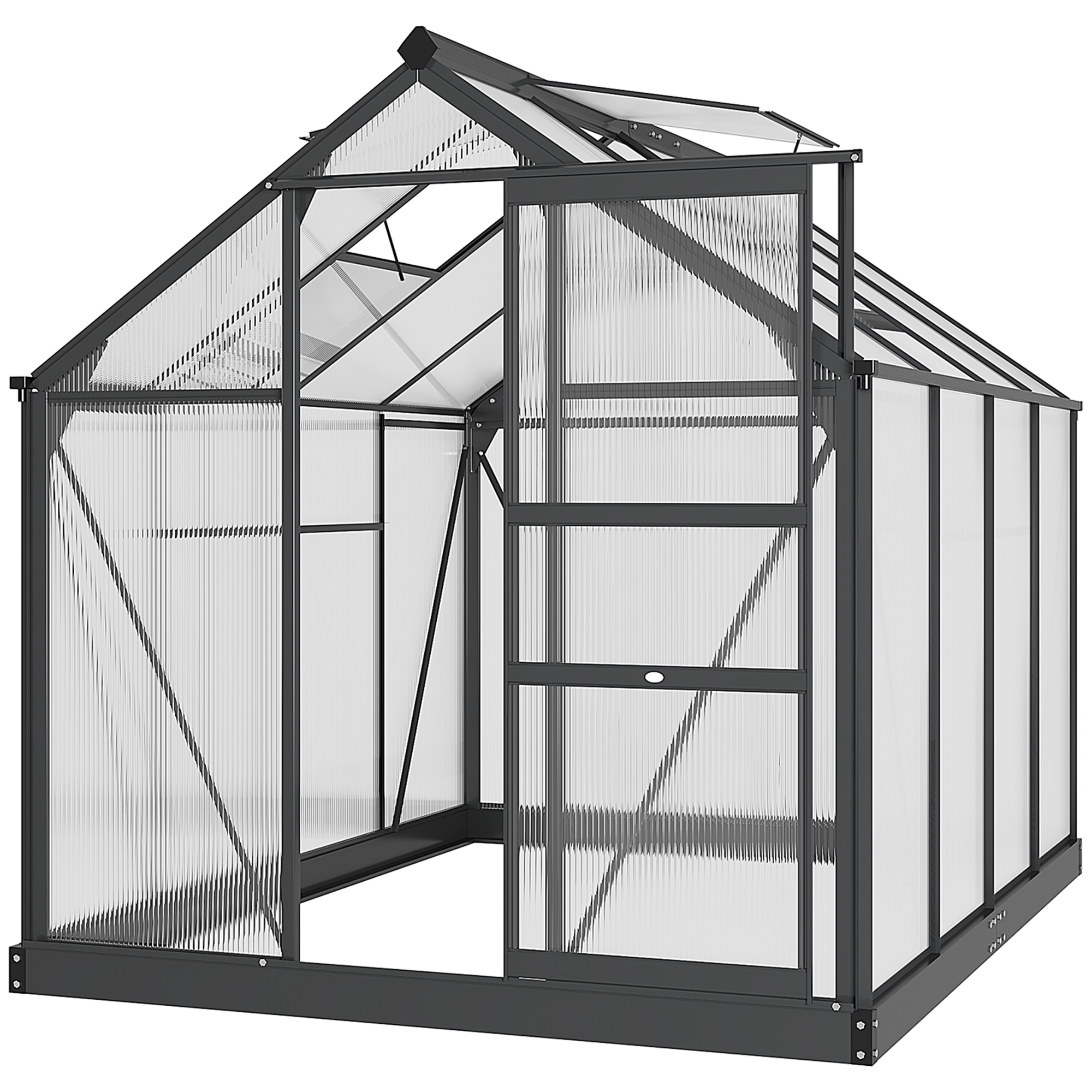 Start and continue the season right with this Outsunny 6ft x 8ft greenhouse. An open, walk-in design means it's easy to enter and leave, whilst giving you the full free space to set it up how you want. A powder-coated aluminium frame means a strong structure, with four ground stakes included to pin to the ground. Features a sliding door for easy access in and out, with a lift-up roof which holds in place - it's easy to let in fresh air, whenever you want.