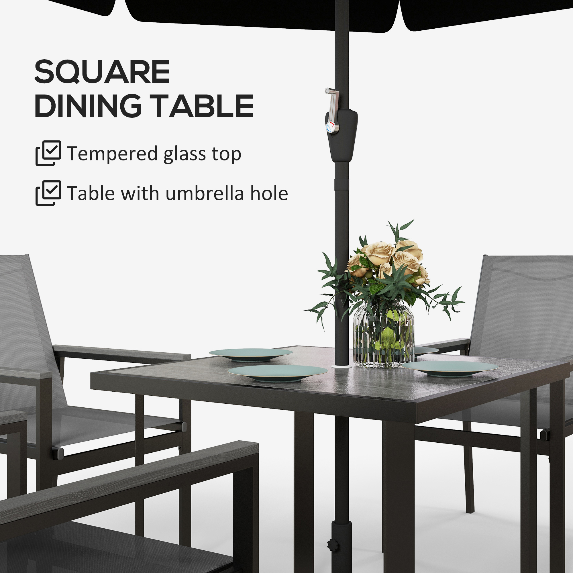 Enjoying weekend brunches and evening dinners outside - thanks to this Outsunny garden dining set. This outdoor furniture set comes with a square dining table and four matching chairs for you and others to gather around. Powder-coated steel frames mean a strong garden furniture set. The wood-effect tempered glass top on the table means a sleek look and safe surface to dine from.