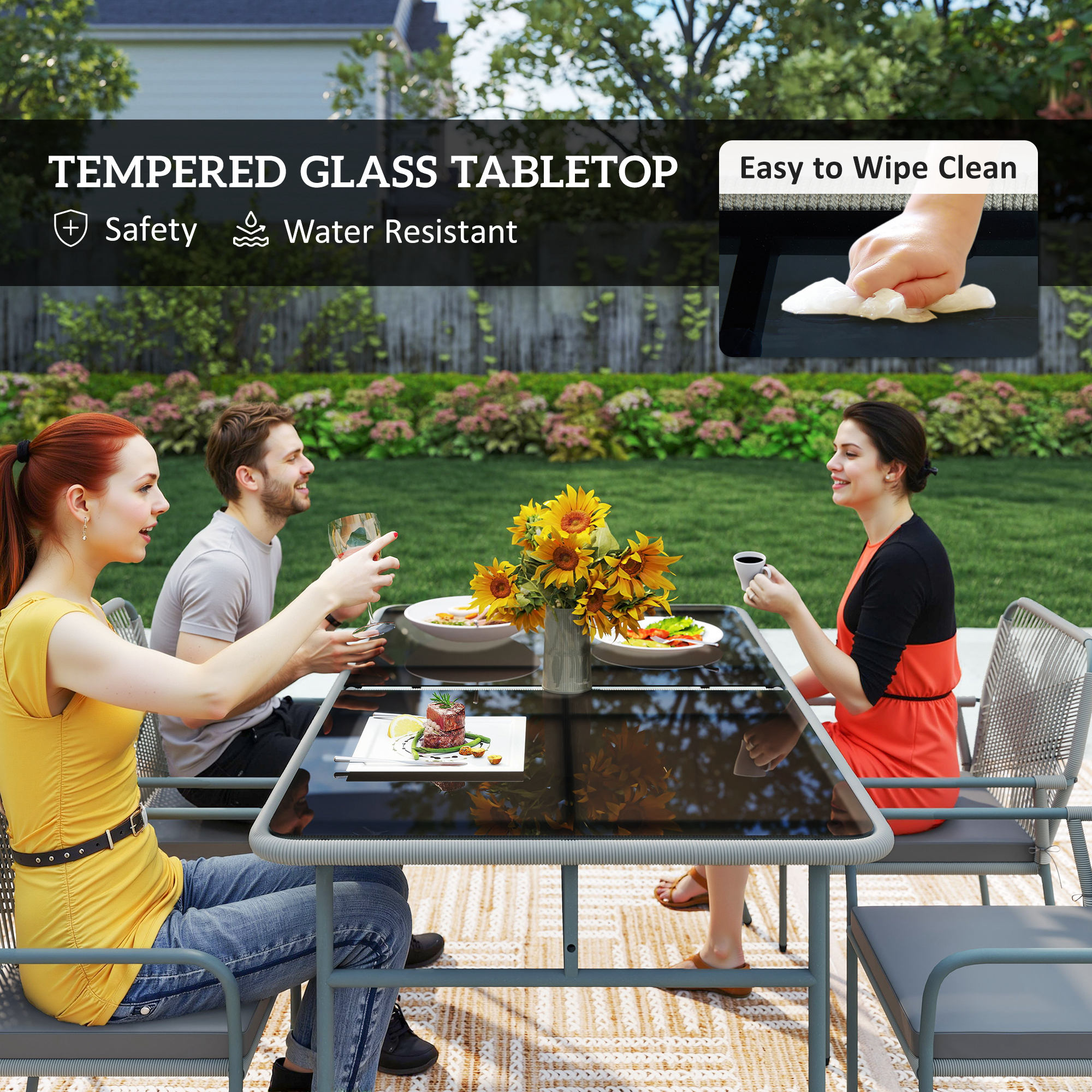 Transform your garden into a chic dining area with the Outsunny rattan garden table and chairs set. This five-piece outdoor garden furniture set includes a sleek, tempered glass top table and four stackable chairs with washable cushions, ensuring style meets convenience. Crafted from all-weather round PE rattan, this patio table and chairs are great for enjoying meals under the sky.
