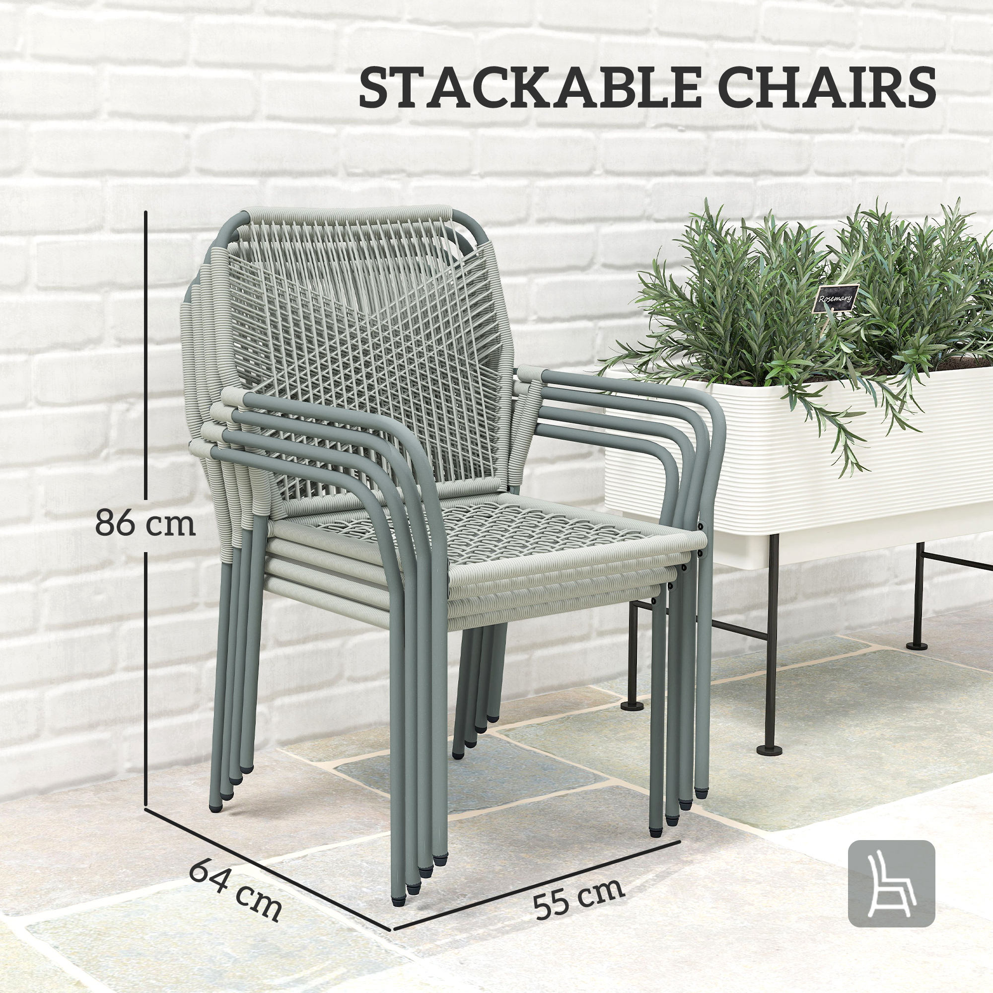 - Four Chairs Stack Size: 55W x 64D x 86H cm