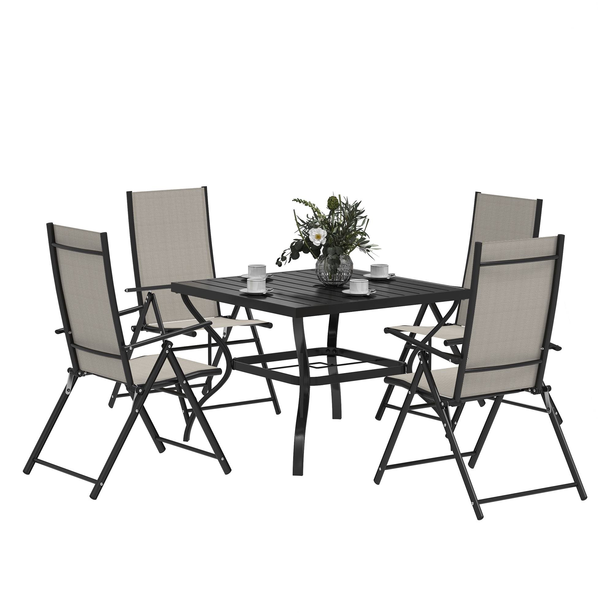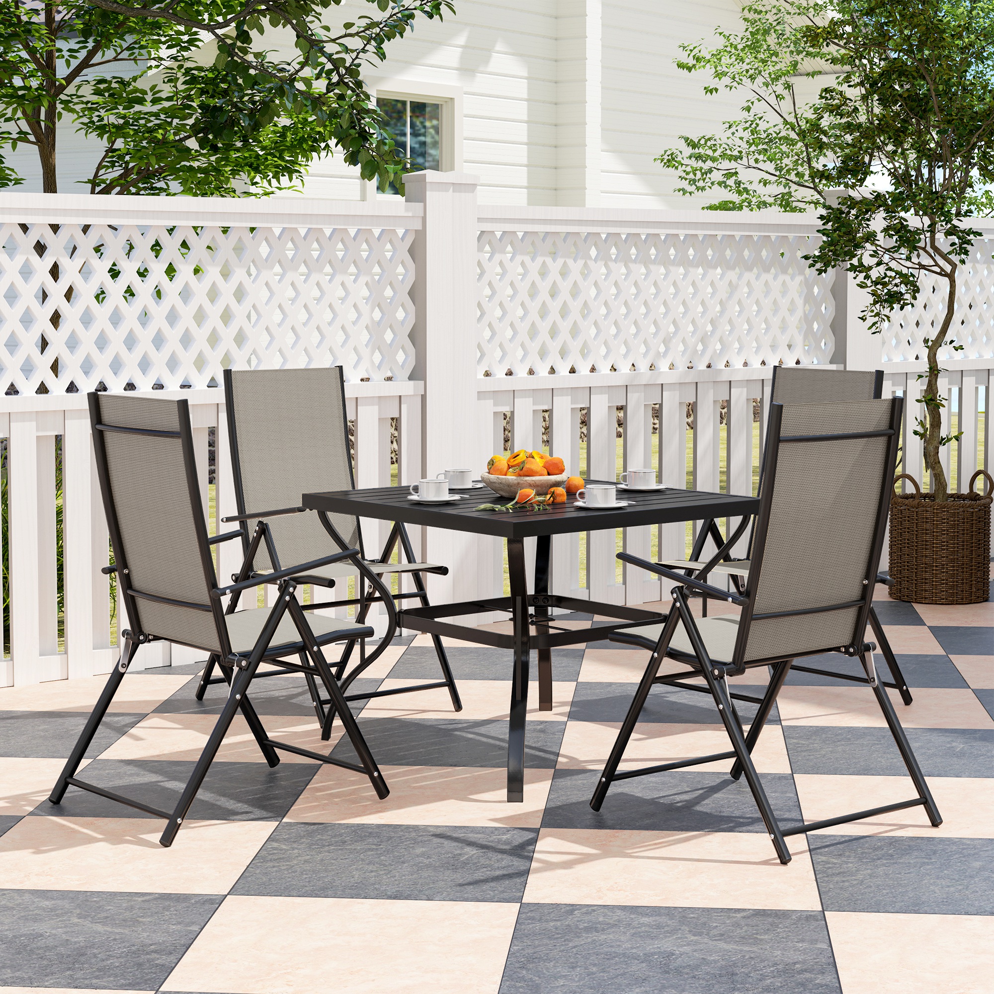 - Patio furniture set comes with a square dining table and four matching folding chairs