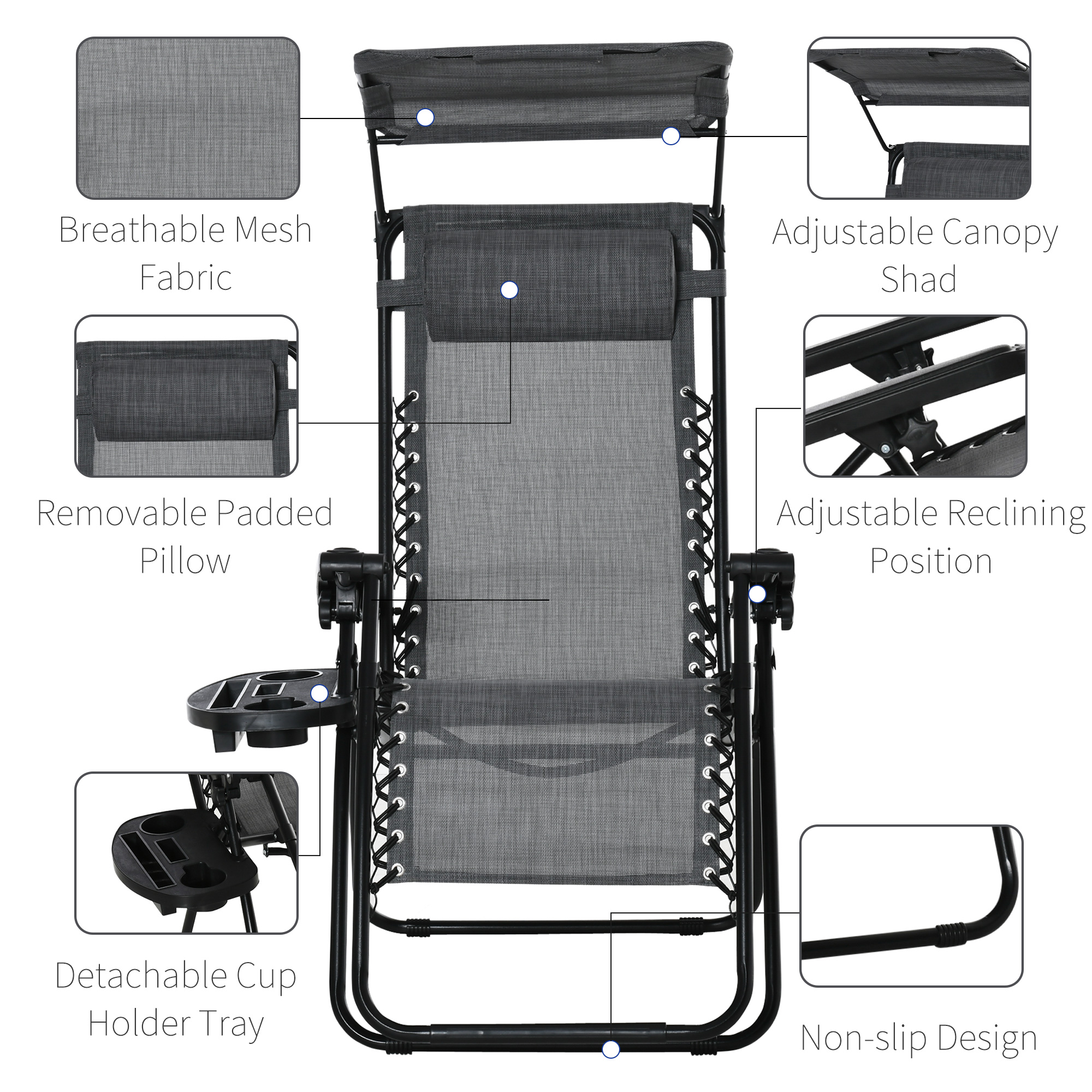 Take your time out in the sun to the next level with Outsunny reclining garden chair. Evenly distributing your weight, sun loungers for garden offers all support your body. Made from powder coated steel for strength and resistance to rusting and peeling, fitted with a breathable mesh seat, a padded headrest for comfort. With an adjustable reclining back, garden loungers equip a detachable side tray to keep drinks, magazines and books close to you. The gateway to total relaxation in your garden.