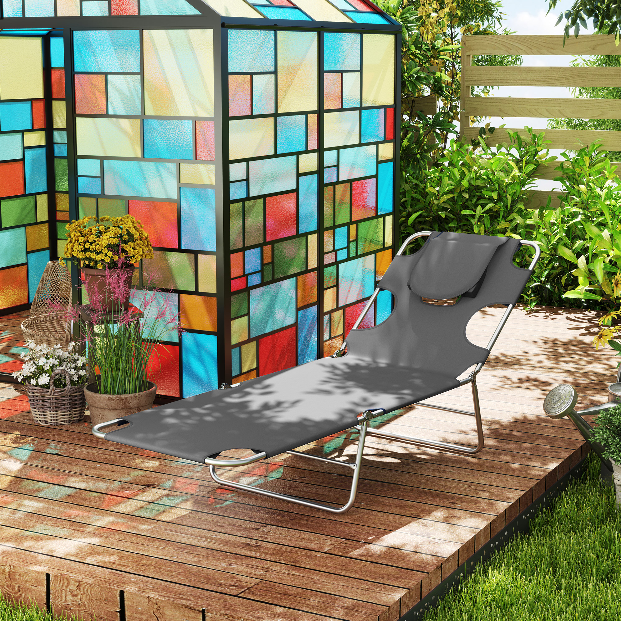 A cool update on the foldable sun lounger set from Outsunny. Features a padded head hole at the front to allow you to rest your face in comfortably, which is perfect for relaxing or even reading a book! The powder coated steel frame is strong and solid to support up to 120 kg. The reclining backrest is five positions adjustable, easy to set and lock to a position you like best. Complete with a handy side pocket.