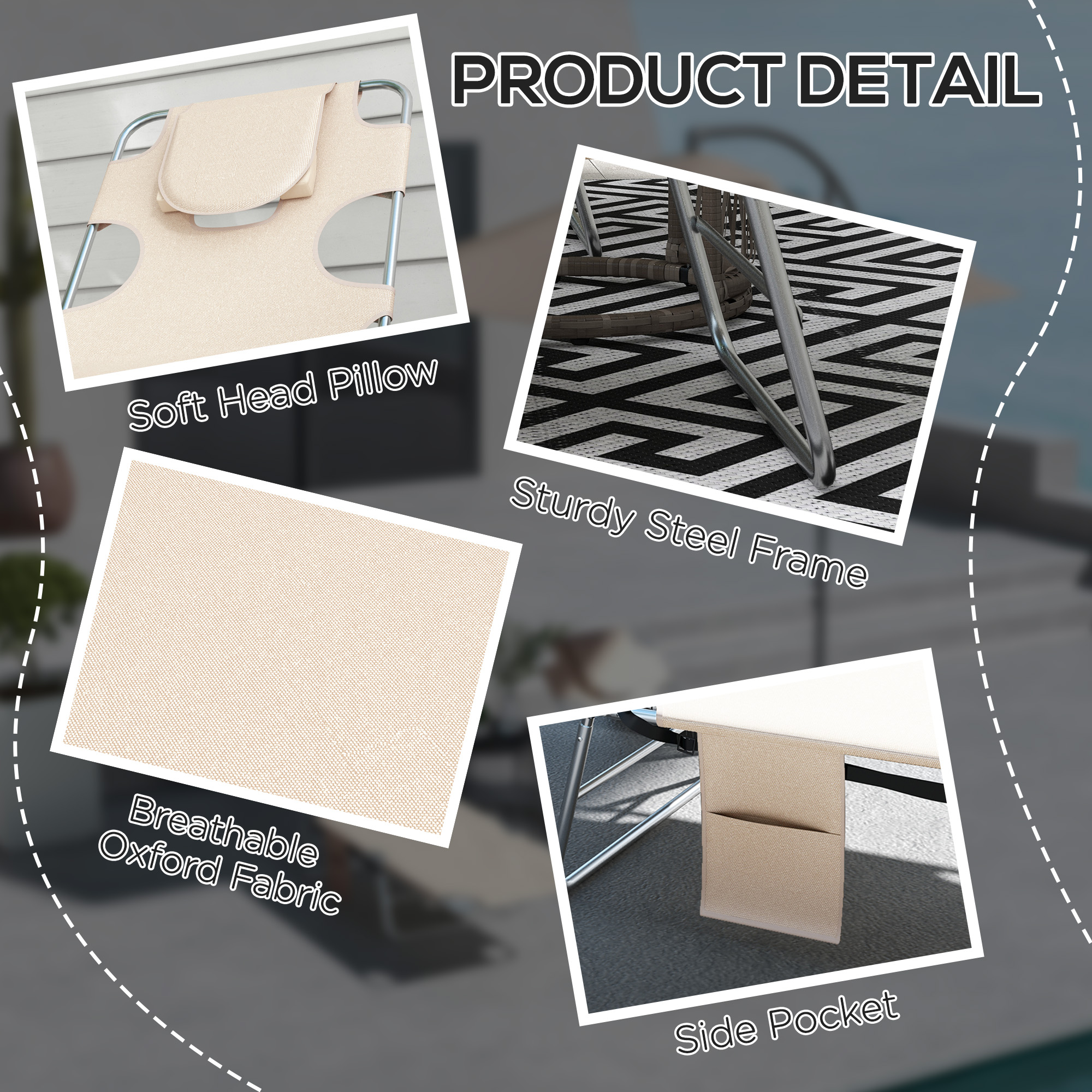 A cool update on the foldable sun loungers from Outsunny. Features a padded head hole at the front to allows you to rest your face in comfortably, which is perfect for relaxing or even reading a book! The powder coated steel frame is strong and solid to support up to 120 kg. The reclining backrest is five positions adjustable, easy to set and lock to a position you like best. Complete with a handy side pocket.