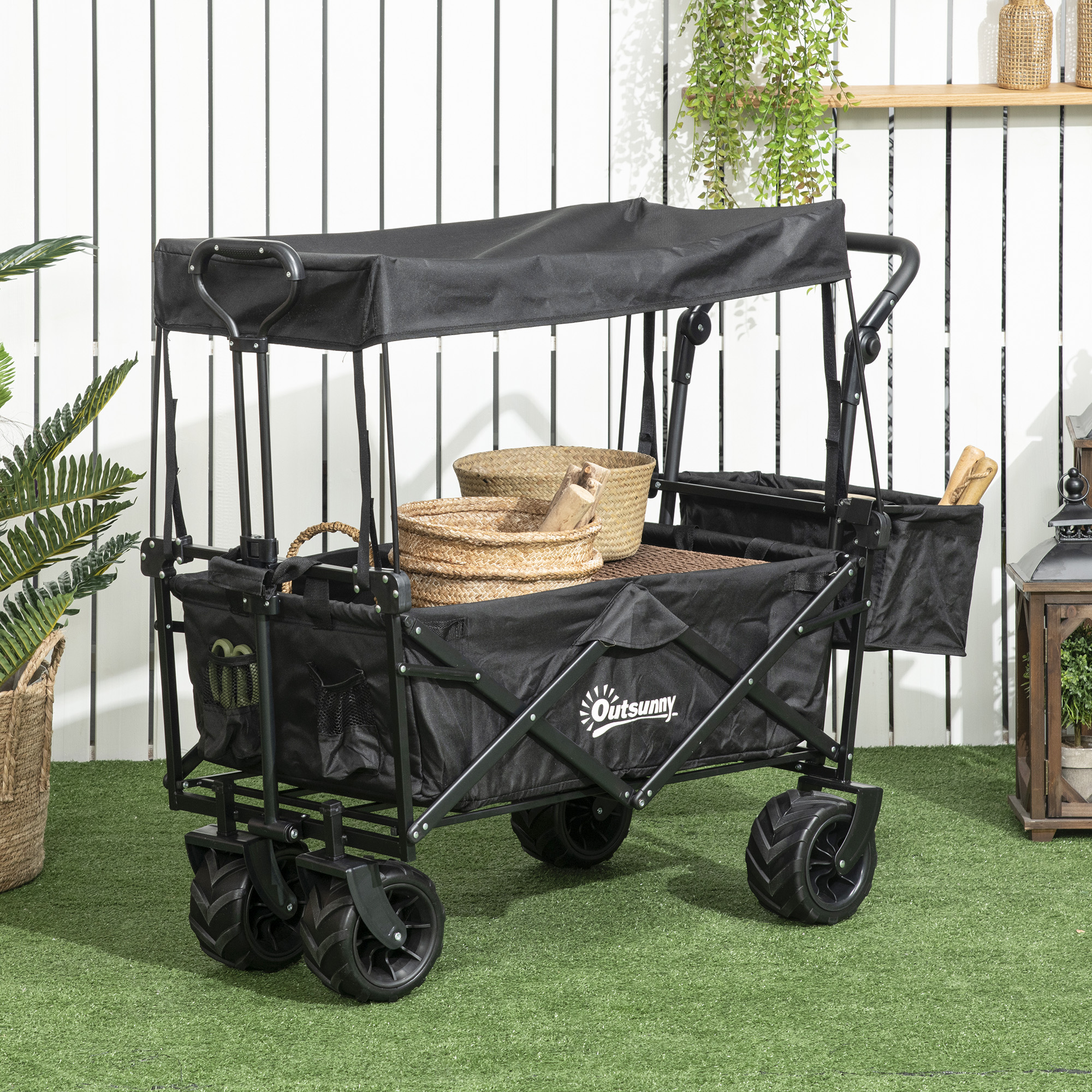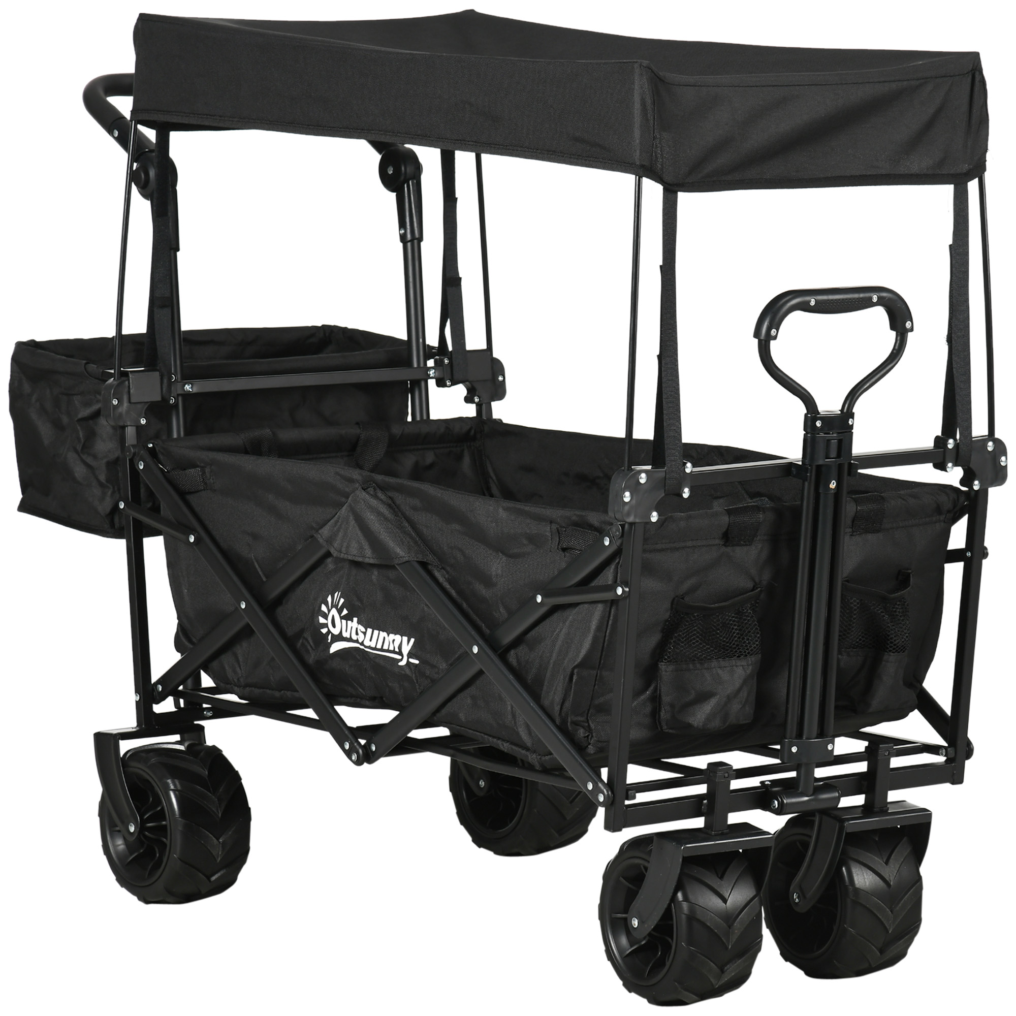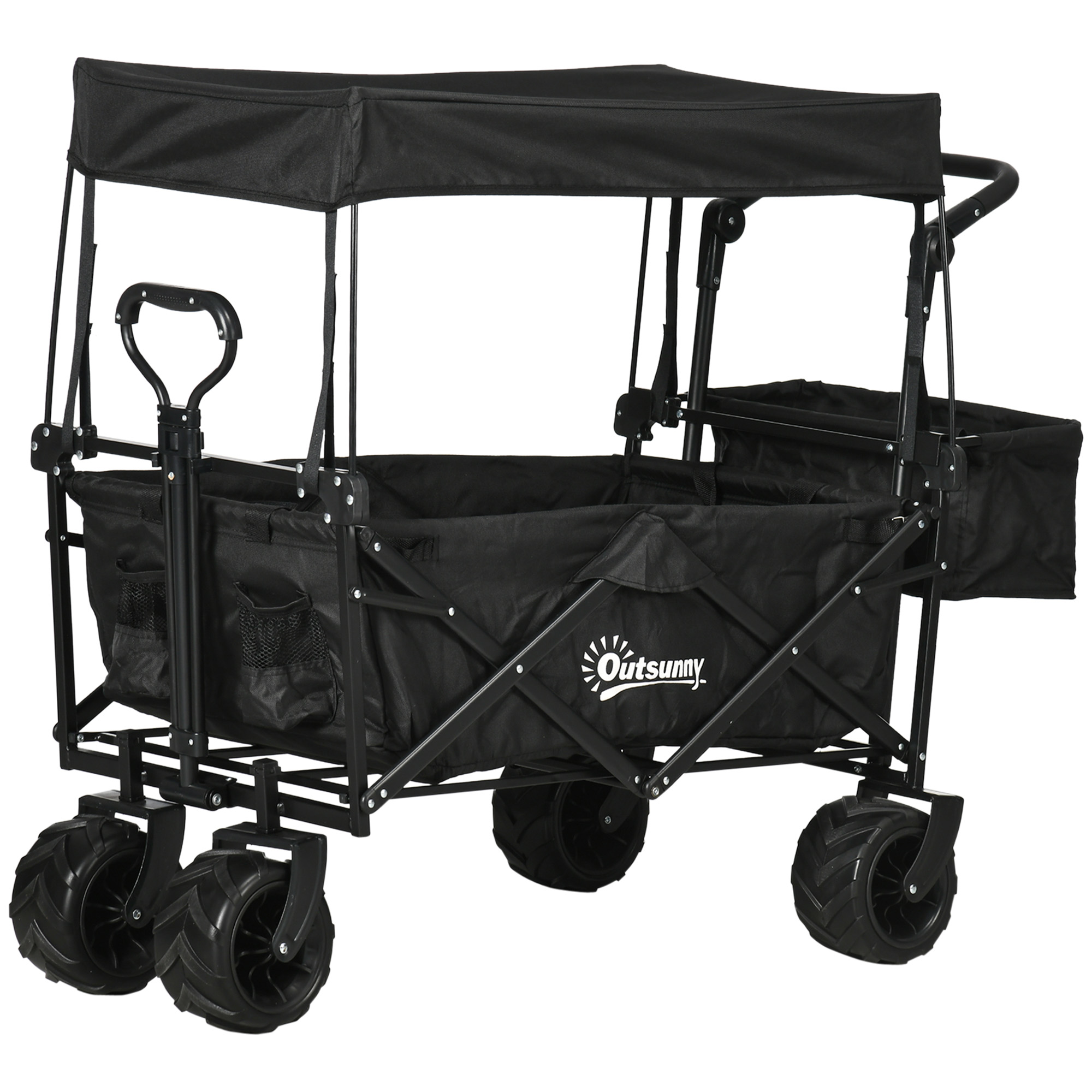 Take the effort out of moving food, bottles, boxes, and everything else in-between with this pull along trolley from Outsunny. A spacious design, it incorporates a large main cart to allow you to move lots of stuff, with a side outer pocket for quick and easy access to anything on the go. Foldable in design for compact storage when not in use, this trolley on wheels is finished with a telescopic pull handle and cup holder. Perfect for visits to the shops, camping trips and festivals.