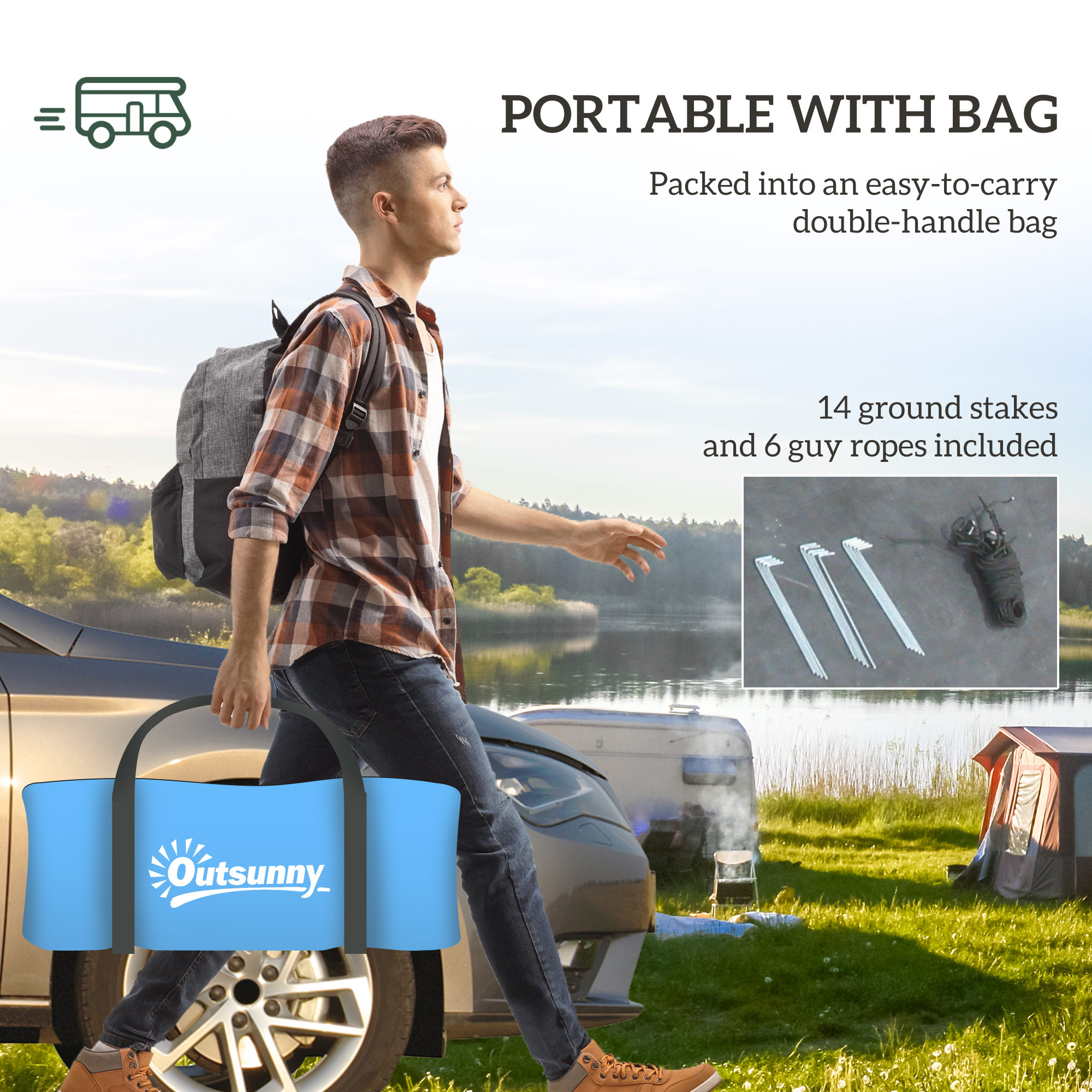 - 14x ground stakes, 6x guy ropes and a carry bag