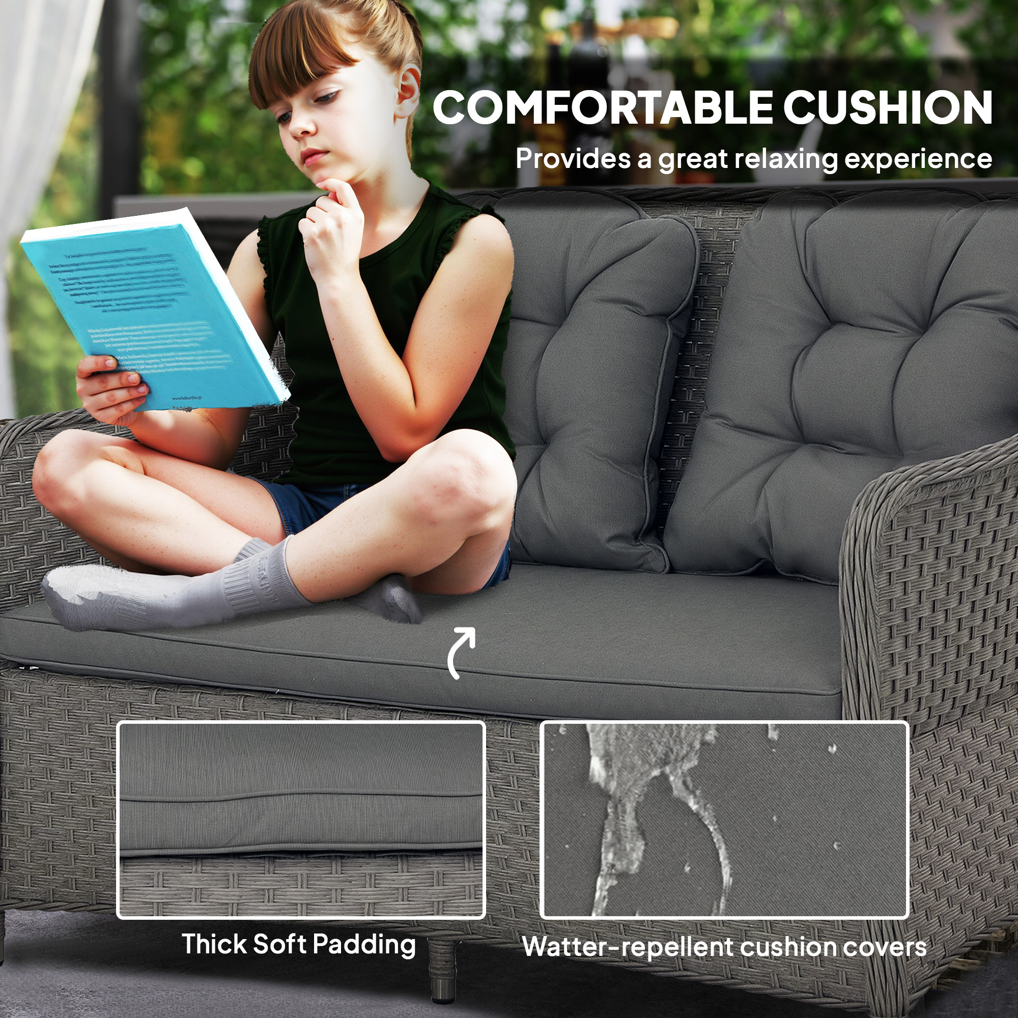 Look forward to afternoons relaxing outside, thanks to this four-piece Outsunny set. Set comes with two chairs, a loveseat and matching coffee table. Aluminium frame for a strong structure, with plastic wicker rattan for a stylish garden furniture set. The table sits level with the chairs - a place to dine from. Seat and back cushions for comfort. Relax in style and comfort all year round.