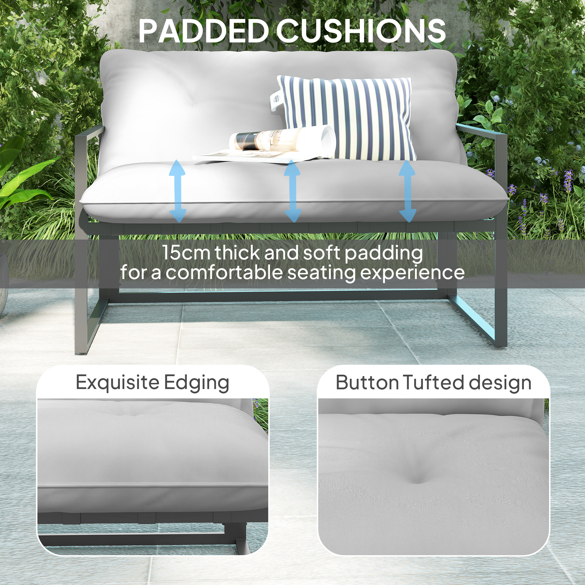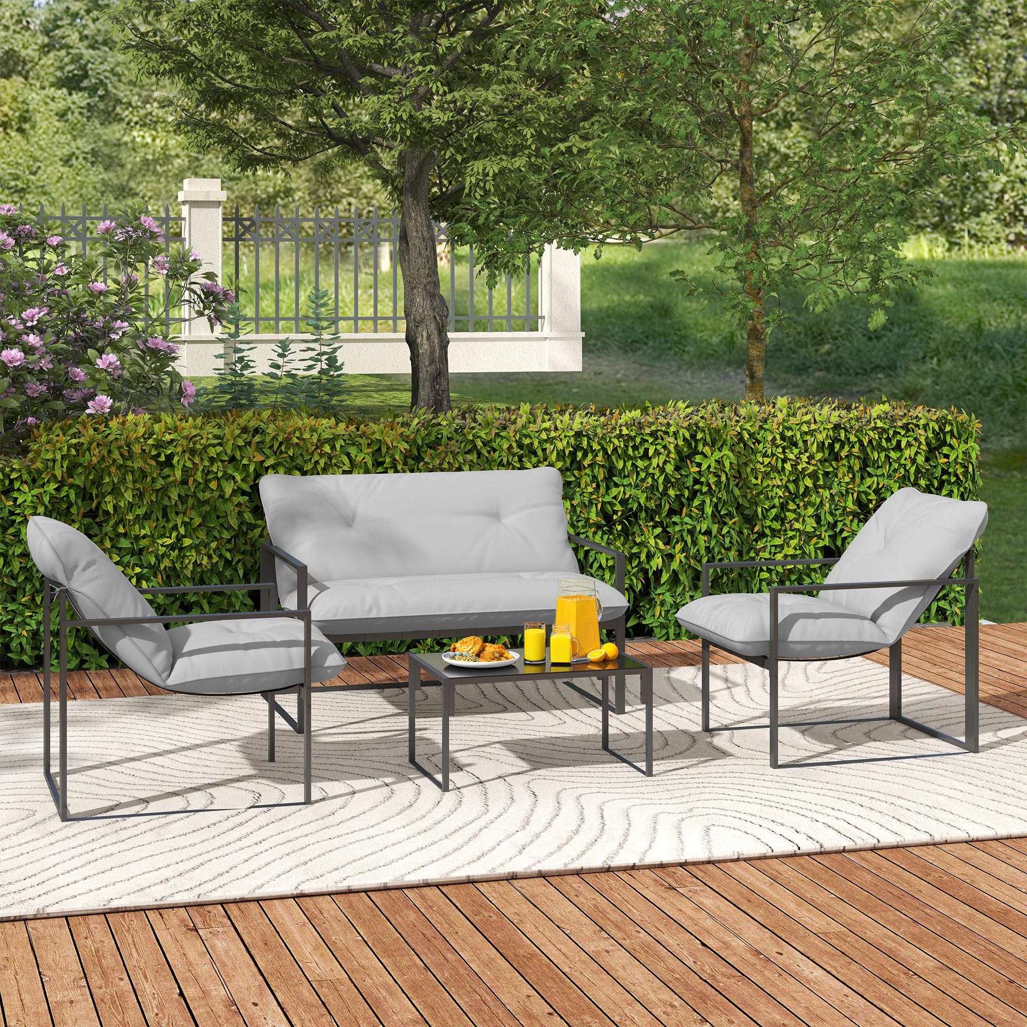 Let friends and family gather around in simple yet sleek style outdoors, thanks to this Outsunny garden set. Comes with four pieces – two armchairs, a two-seater sofa and a dining table; all with steel frame for a tough and strong structure. Thick padded cushions on the seats and backs for comfort as you relax. A tempered glass on the long table adds a beautiful finish, with protective pads on each foot for balance.