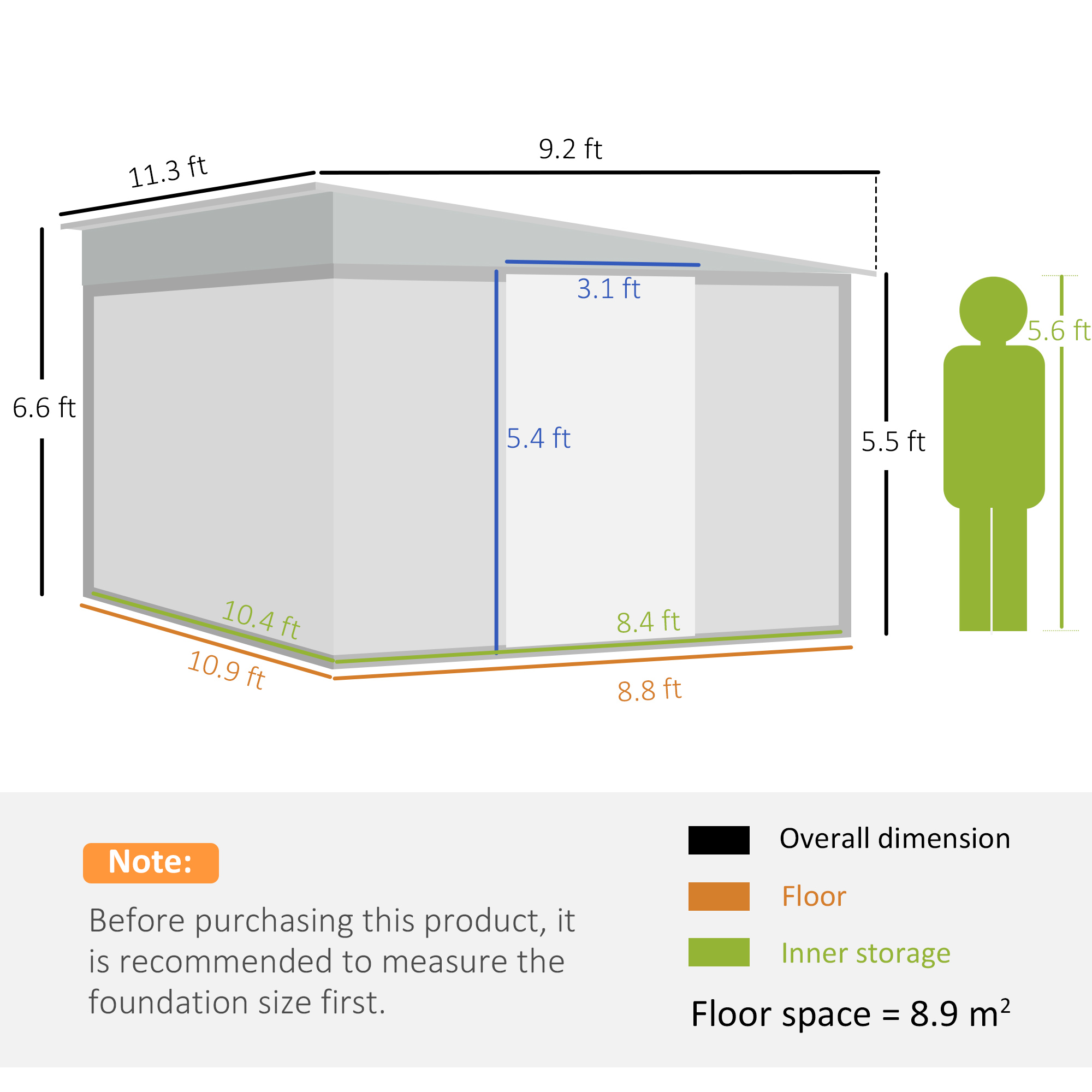 - Bottom Dimension: 268W x 333Dcm (8.9m²)