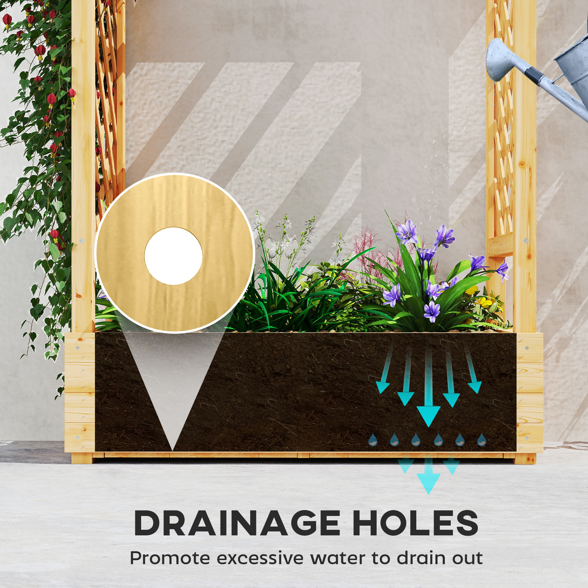An all-in-one spot for plants and more, with this Outsunny garden bed. Made from fir wood, this is a naturally strong and beautiful piece - suitable for year-round use. It's formed of a 85 x 38 cm garden bed for growing plants, flowers, fruits and more; two side trellises for climbing plants, plus upper rails for hanging baskets. Complete with four holes on the bottom for easy and effective water drainage.