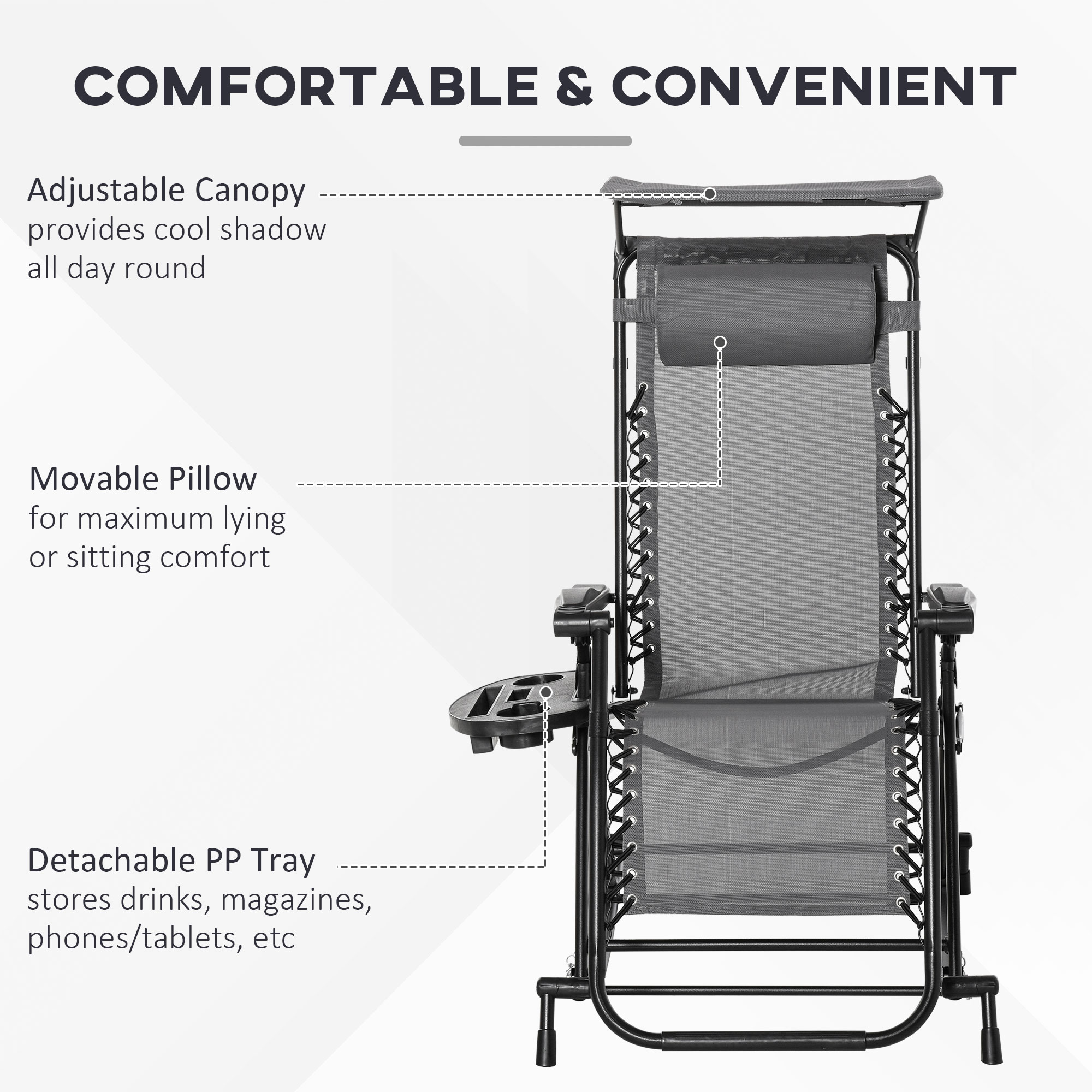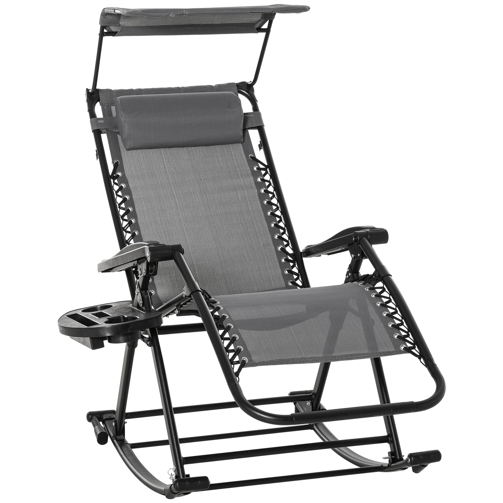 The garden rocking chairs for adults from Outsunny are the perfect gateway to total relaxation in the sun. The powder-coated steel frame forms a tough structure, where the seat is attached to the base for a floating zero-gravity feel. The back freely adjusts between a 10°-35° angle so you can lie back to a position you like. The fabric seat and padded headrest make the garden rocker comfortable, finished with a handy side tray and top canopy to shield you safely.