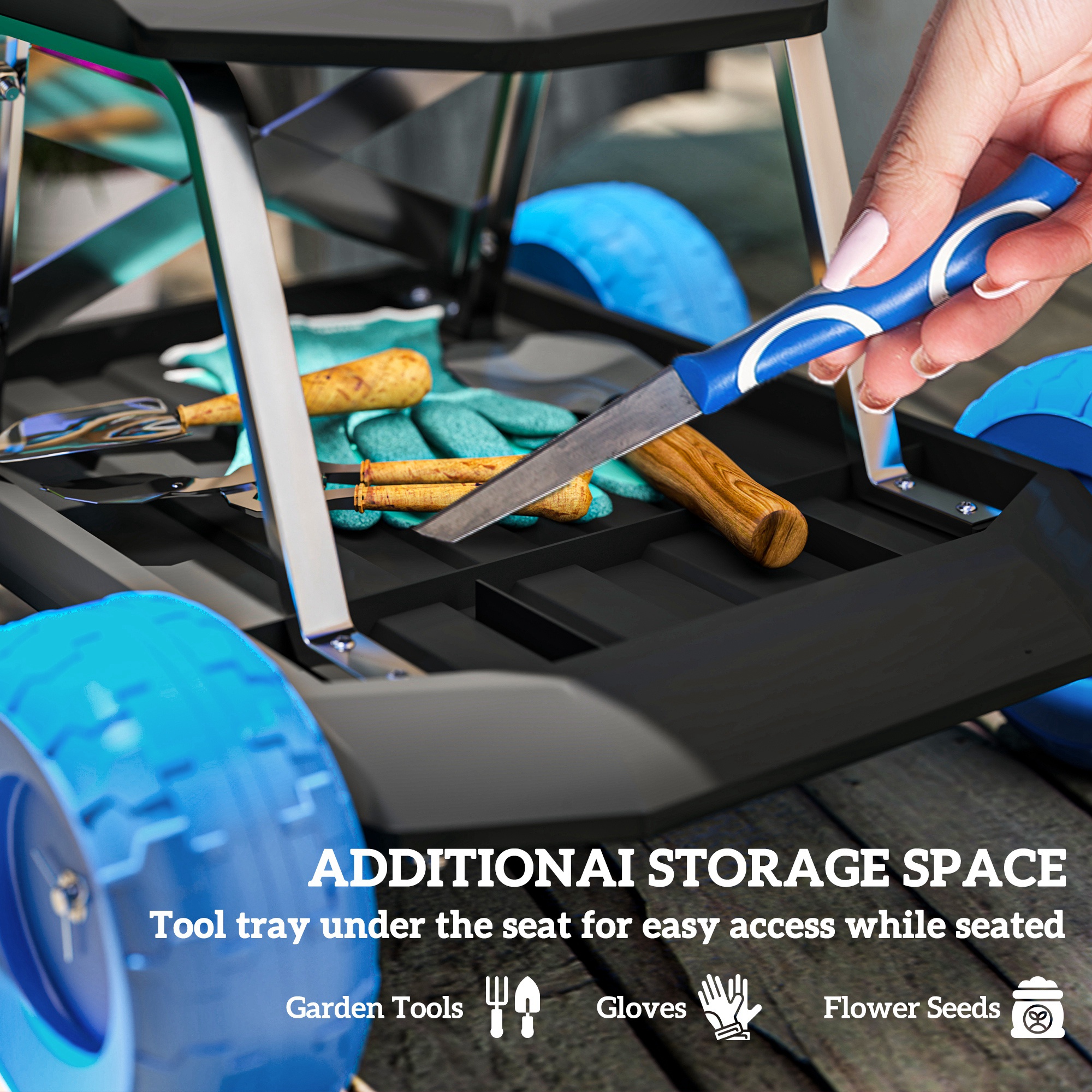 - 32Hcm top seat allows you to sit elevated and comfortable. Helps reduces knee and back strain whilst gardening