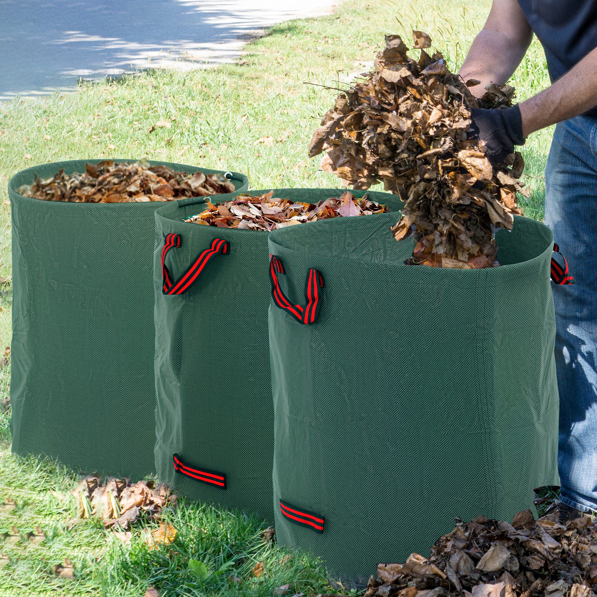Discover the ease of garden clean-up with Outsunny's Garden Waste Bag! This set of three large garden rubbish bags boasts a spacious 272L capacity each, crafted from heavy-duty, UV-protected polypropylene. Featuring four robust handles for effortless carrying and emptying, they are your go-to solution for keeping your garden neat. Plus, they're foldable, reusable and versatile beyond just garden rubbish!