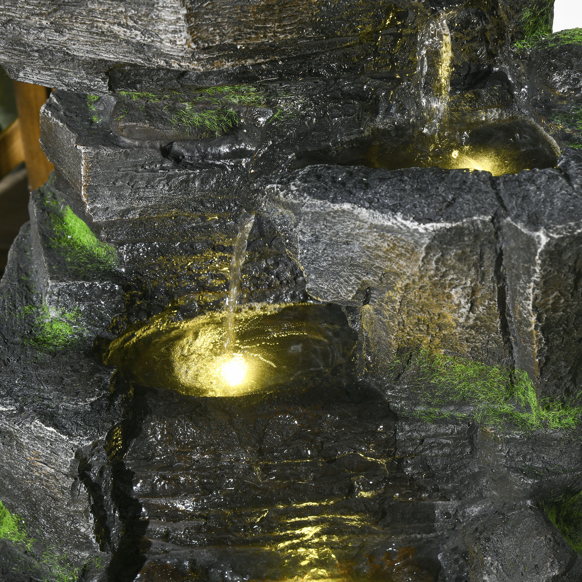Transform your garden into a tranquil oasis with the Outsunny garden water feature. This enchanting four-tier waterfall, complete with three LED lights, creates a serene atmosphere as dusk falls. Solar-powered for nighttime enjoyment and designed with a natural grey stone rock tower with moss accents, it seamlessly blends into your outdoor space, inviting relaxation beside your very own garden waterfall.