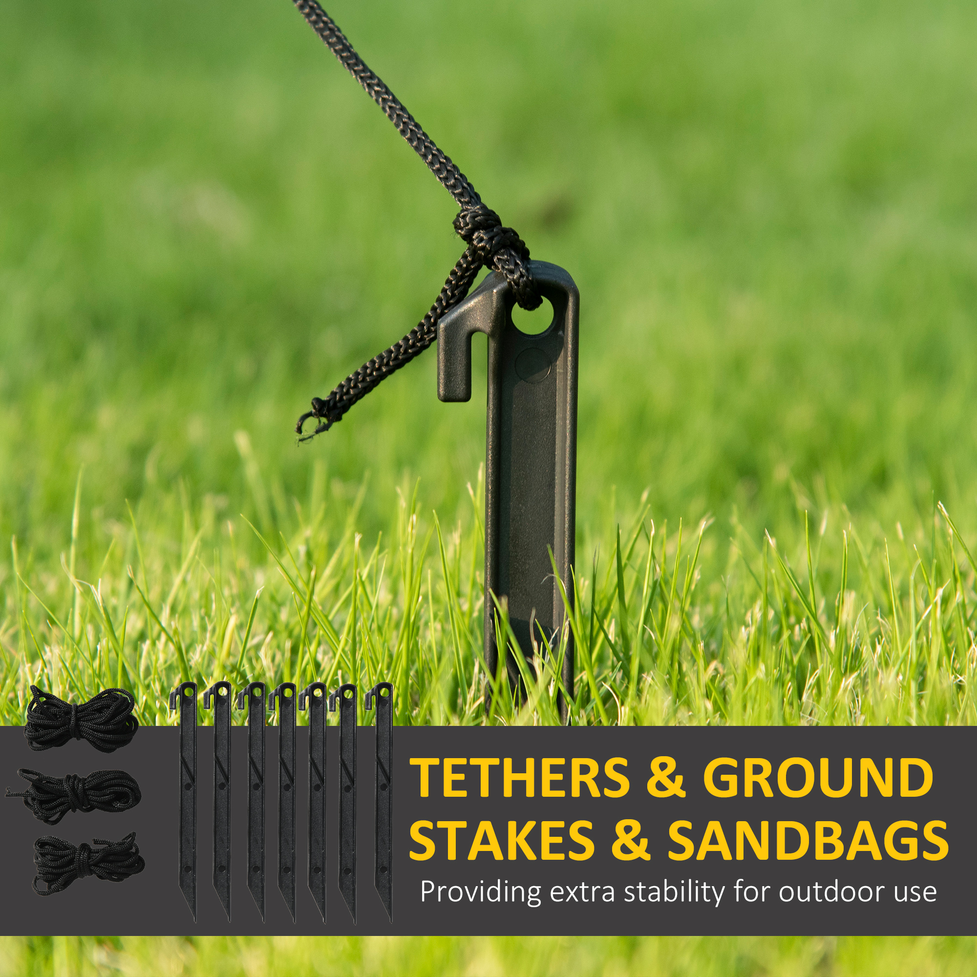 - Seven ground stakes, three guy ropes and four sandbags to pin and stabilise to ground
