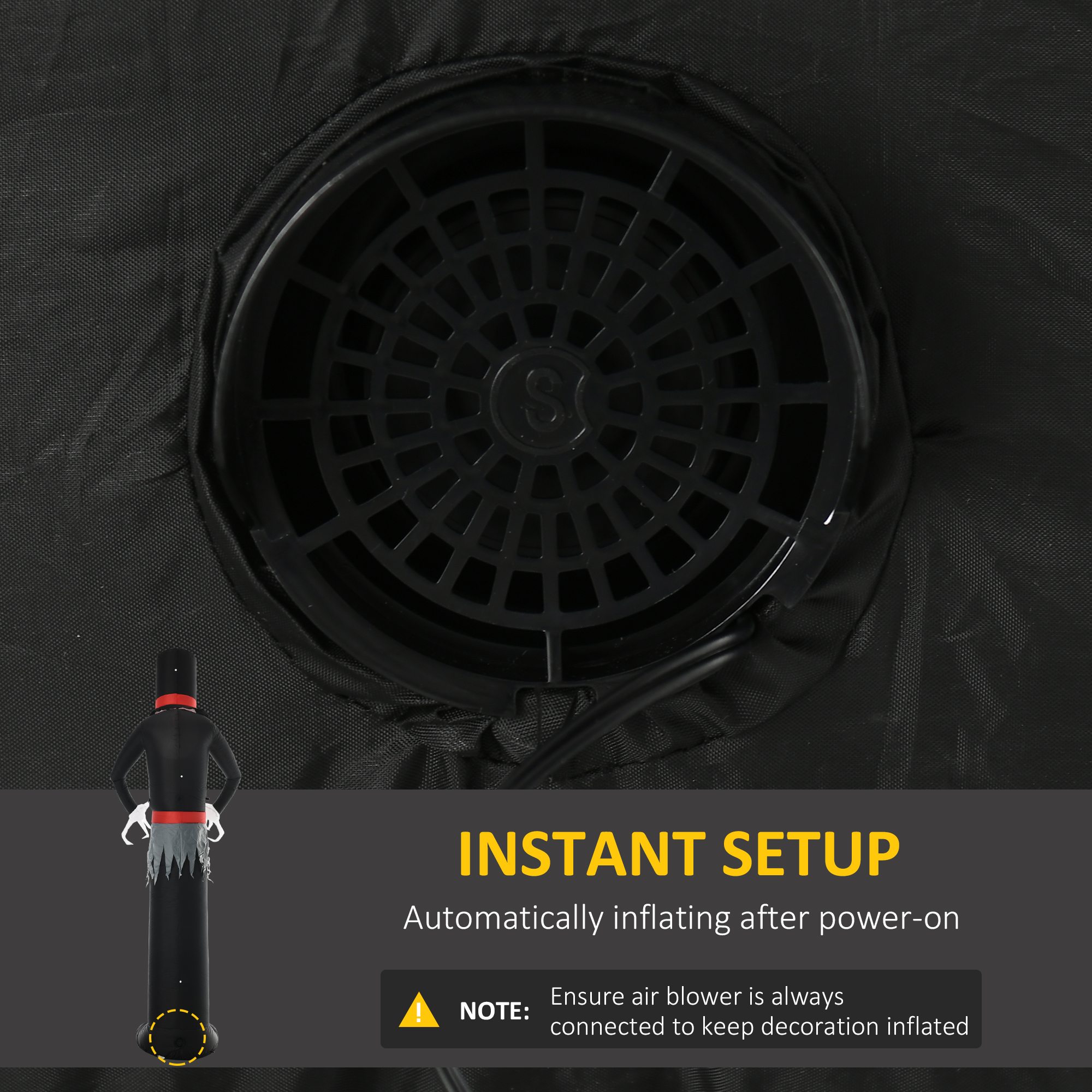 - NOTE: Ensure the air blower is always connected to a power source to keep the Skinny Ghost inflated