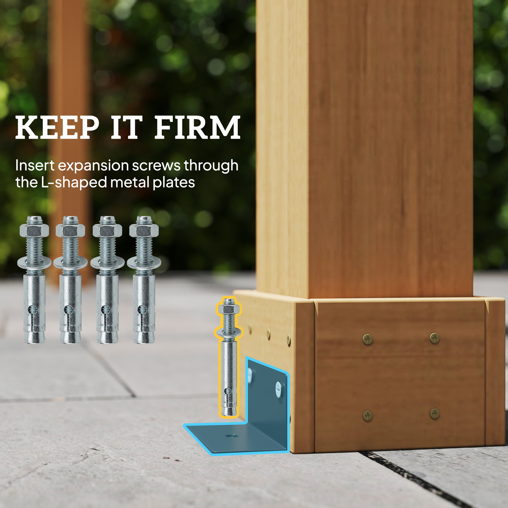 - Robust 12 x12 cm columns, with screws and L-shaped metal plates for stability