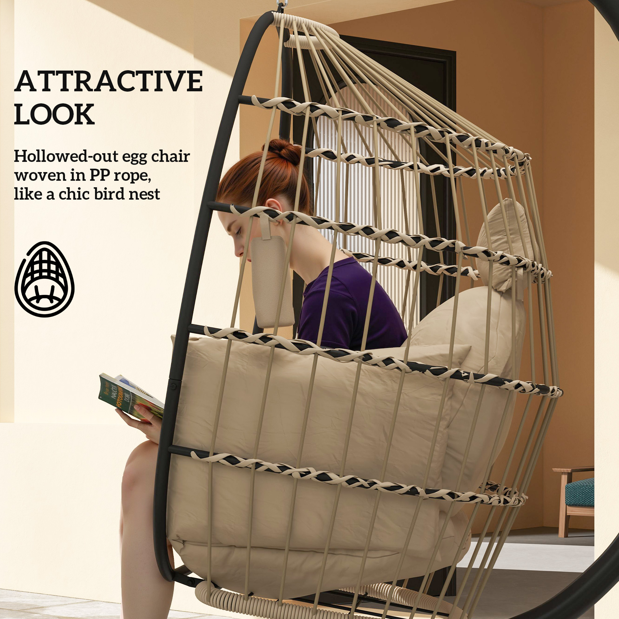 - Egg-shaped swing chair mimics a bird nest, wide seating