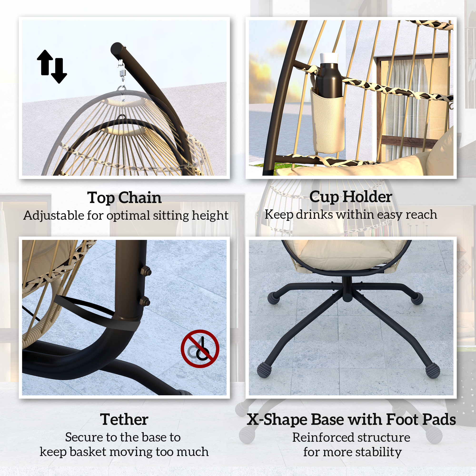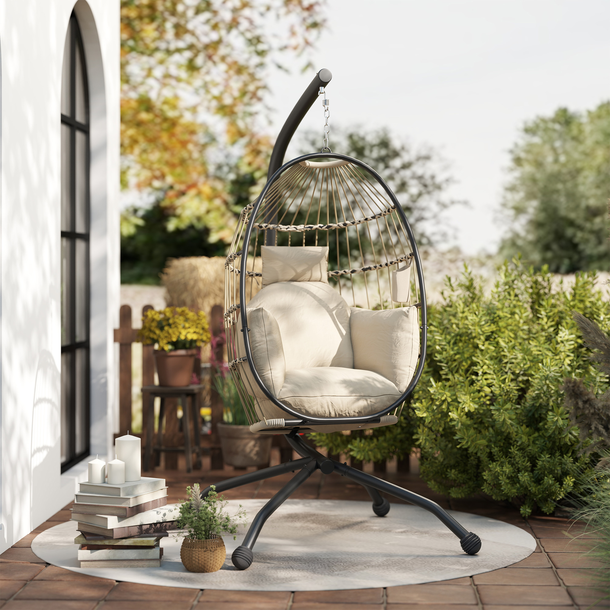 Relax in optimal comfort with this outdoor egg chair from Outsunny! This egg garden chair with a hollowed-out design woven in ropes is like a cosy bird-nest retreat. The folding basket allows easy storage, with a cup holder keeping your drink close. 20cm thickened cushion with armrests and a separate head pillow offer luxurious comfort. Powder-coated steel frame and X-shape base mean a stable swinging egg chair. Adjustable top chain customises your swinging experience.
