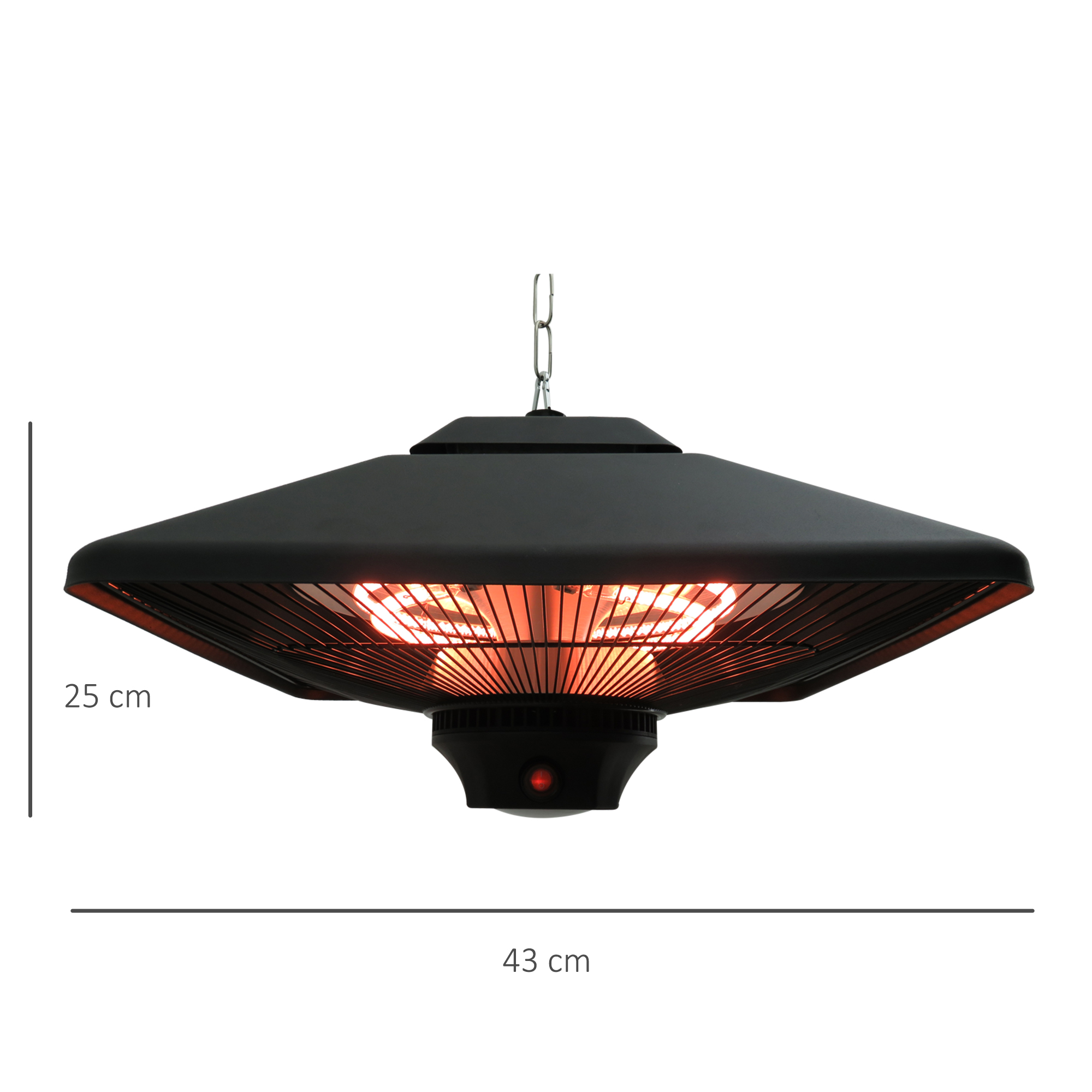 This Outsunny hanging patio heater is a great addition to your outdoor living space. The electric patio heater has a 2 in 1 function of a heater and a LED lamp to illuminate the area right underneath it. The outdoor electric heater comes complete with chains and hooks, enabling heater for gazebo to be adjusted in height if required. Great to have during the cooler summer evenings and during winter to enjoy your garden or patio.