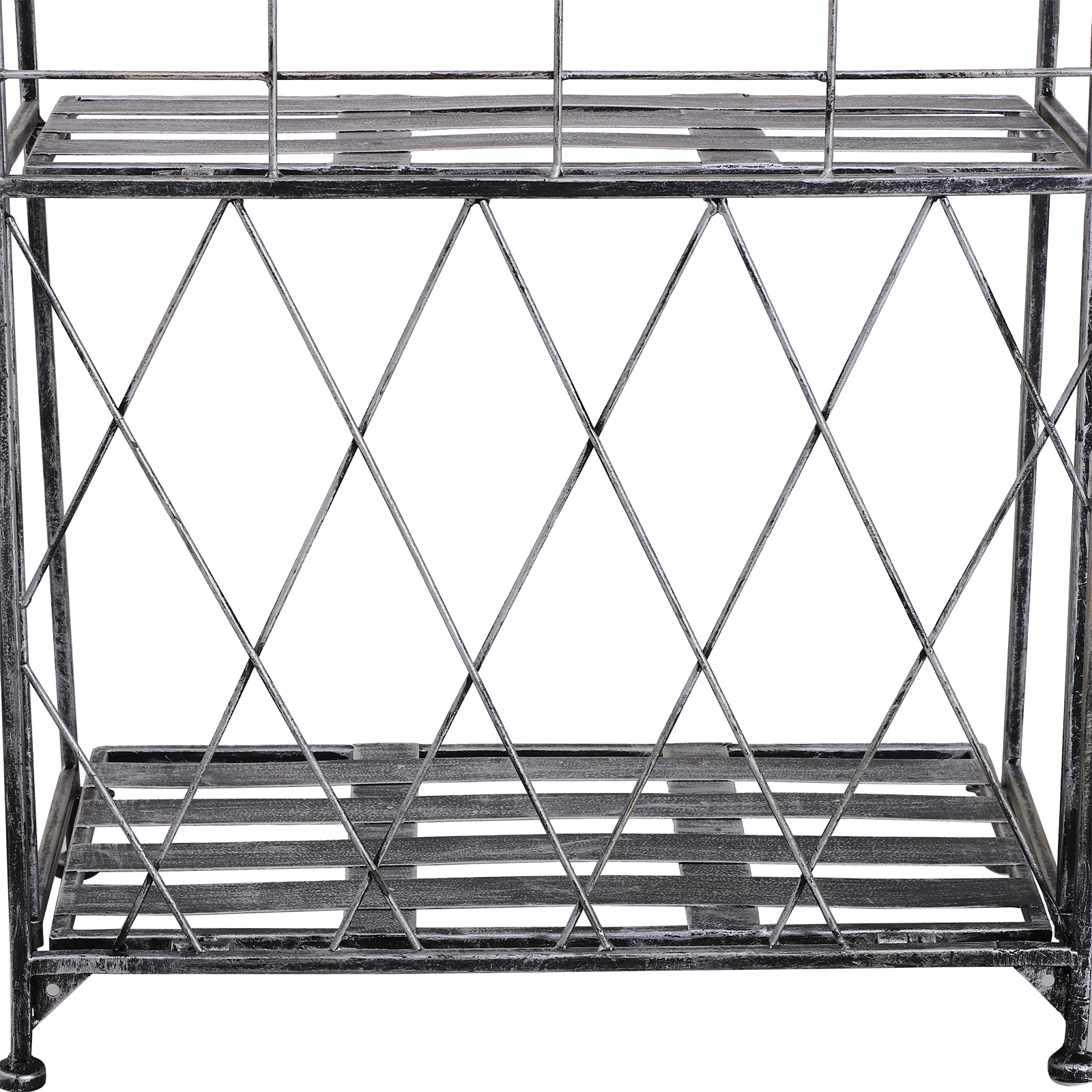 - 3-Tiered freestanding plant stand made of metal and featuring elegant scrollwork accent