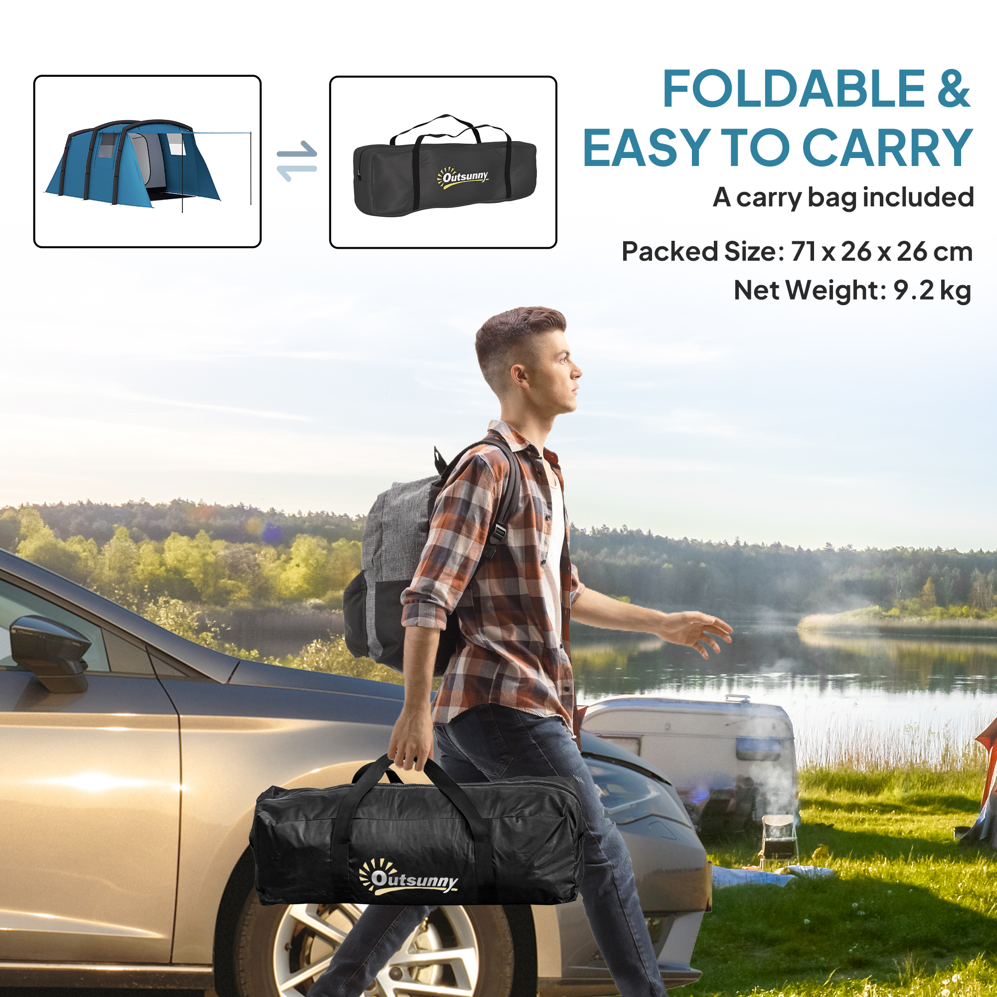 Discover the great outdoors with the Outsunny inflatable 6 man tent, your spacious escape for up to 6 people. Quick to set up with three TPU air beams, this blow up tent boasts a 210T polyester fabric for top-notch waterproofing and UV protection. Enjoy the comfort of separate living and sleeping areas and the convenience of a removable groundsheet, all packed into a light, easy-to-carry design.