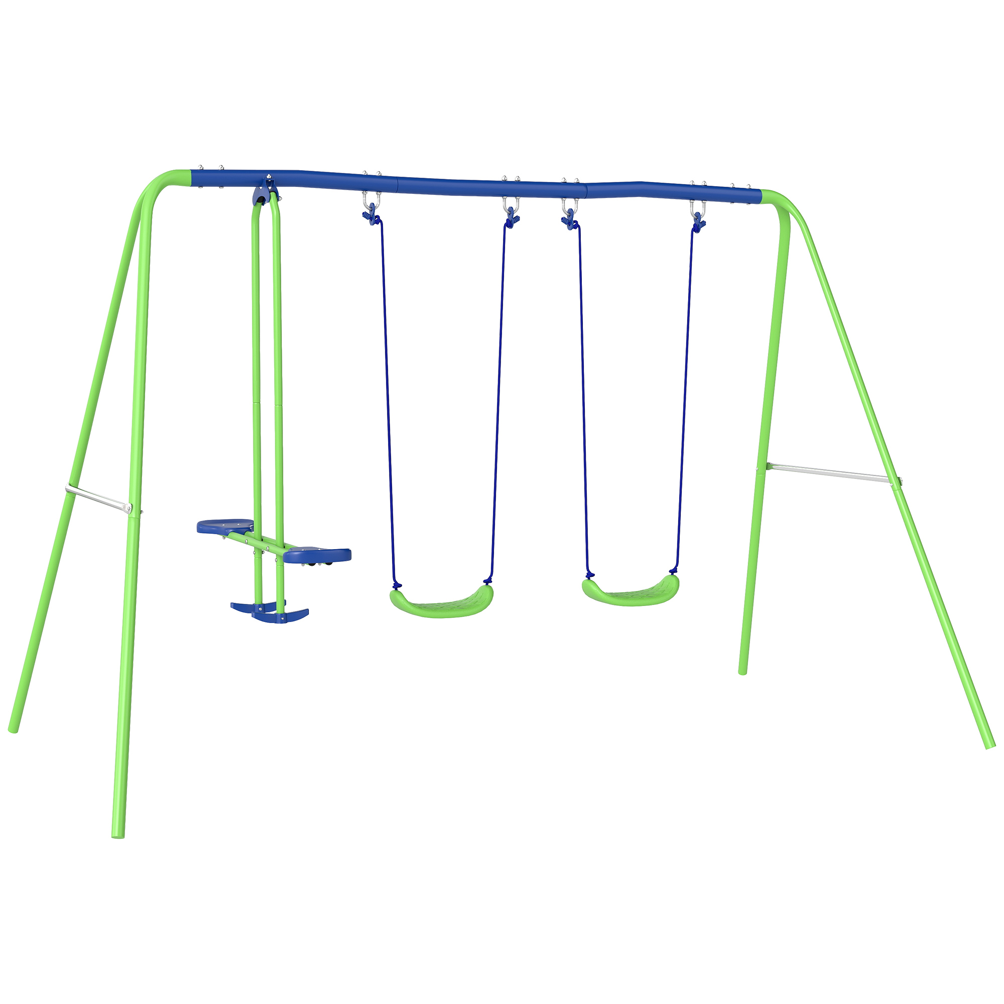 Double the fun for childrens playtime, thanks to this outdoor swing sets for kidsfrom Outsunny. Design comes with two swing seats and a double seat glider, which breezes back and forth smoothly: giving kids a chance to play with their friends/parents. Glider is fitted with foot rests for comfort. The swing seats are safely attached to the frame; the rope length is adjustable, making it suitable for children of different heights and as they grow. The metal frame, made into an ‘A’ shape for balance, is finished in bright green for extra fun.
