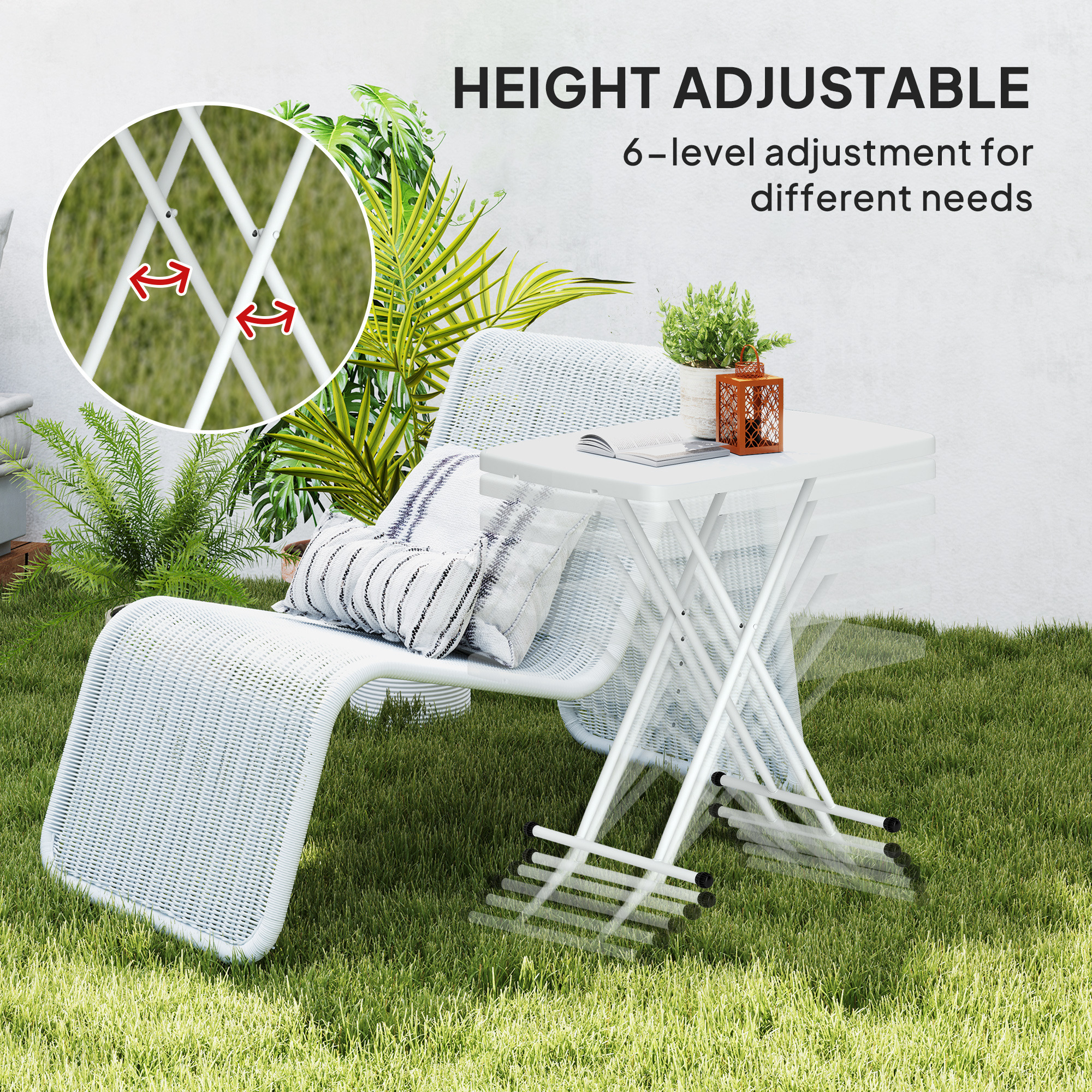 Set up and go when eating during your outdoor adventures. This Outsunny picnic table is a compact and lightweight piece, so you can take it with you to festivals, camping trips and similar. The powder coated metal frame means a strong, supportive core - fitted with a tough plastic tabletop which is easy to wipe clean for optimal hygiene. Frame height sets to six positions between 6-74 cm: accommodating users of all ages and heights.
