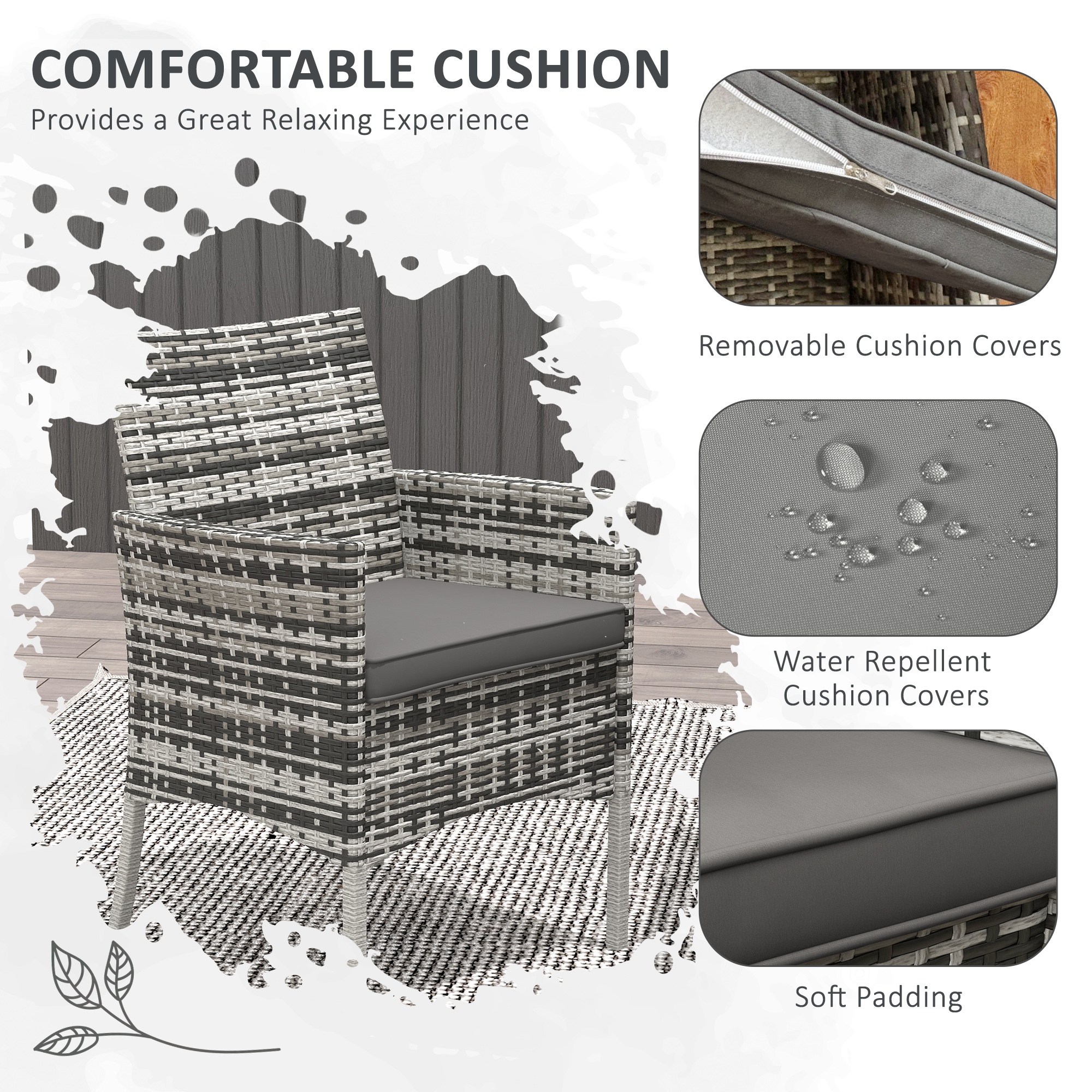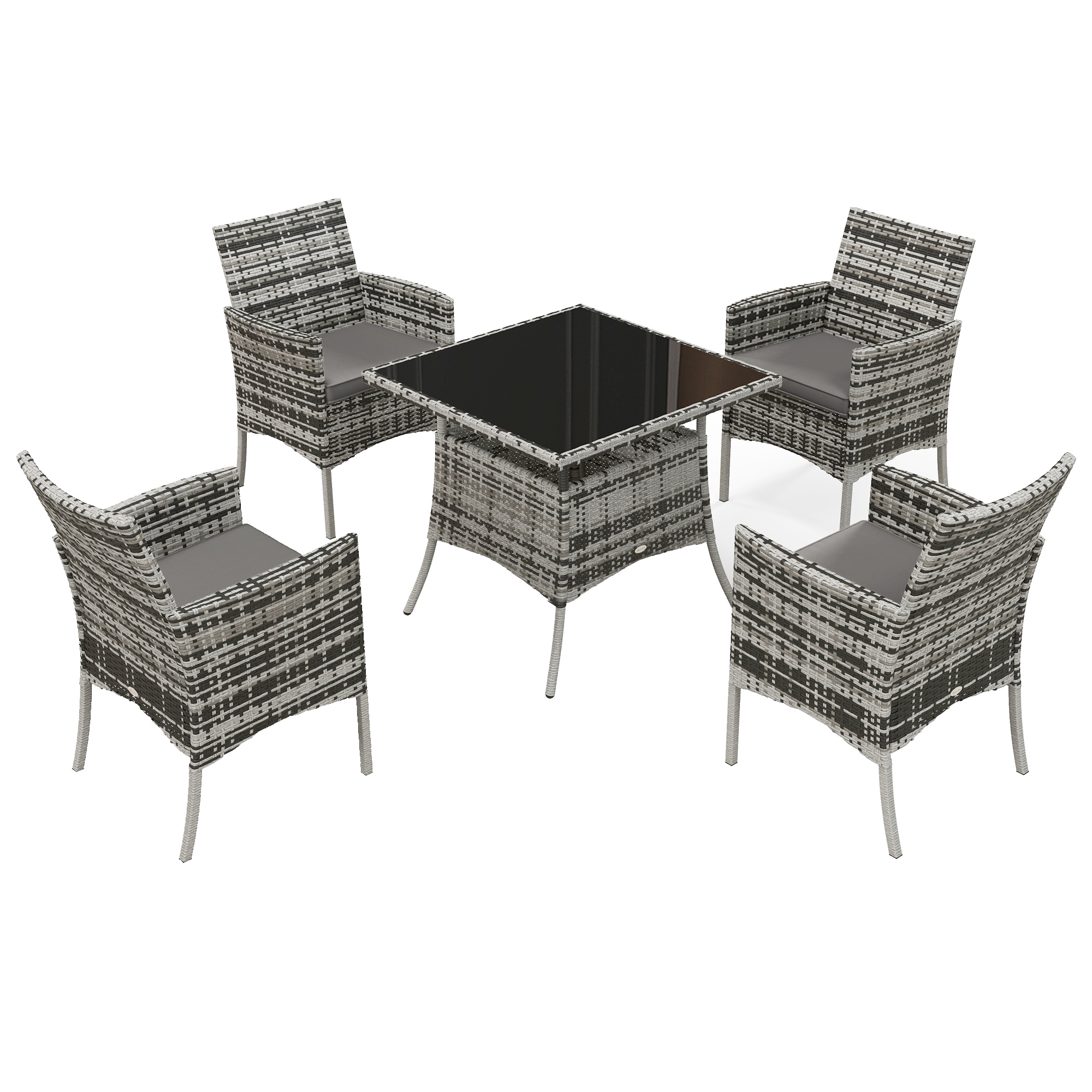 This Outsunny five-piece garden table and chairs are here so you can relax with company. Powder coated steel frames are strong and supportive. Cushions add comfort. The tempered glass tabletop is sleek. This rattan garden furniture set comes with four chairs and a matching table.