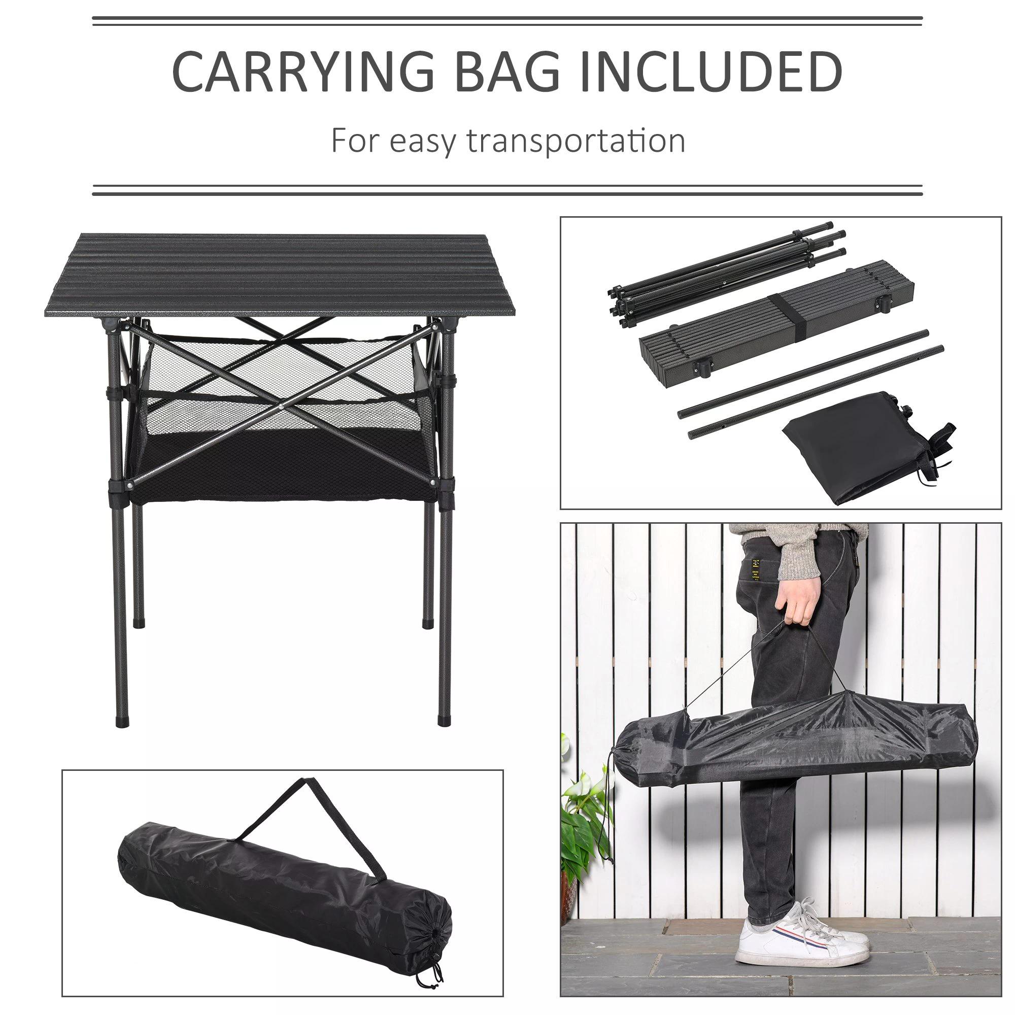 Enhance your outdoor experience with this portable garden table! It can be used as an outdoor dining table, BBQ table, laptop table, gaming table. Perfect for camping, beach, backyard, patio picnic. A mesh basket underneath this table-top to put small garden tools, mobile-phones or other stuff. Surface is made of aluminum, water resistant and stain-resistant. And frame, made from strength steel, makes it sturdy and durable.