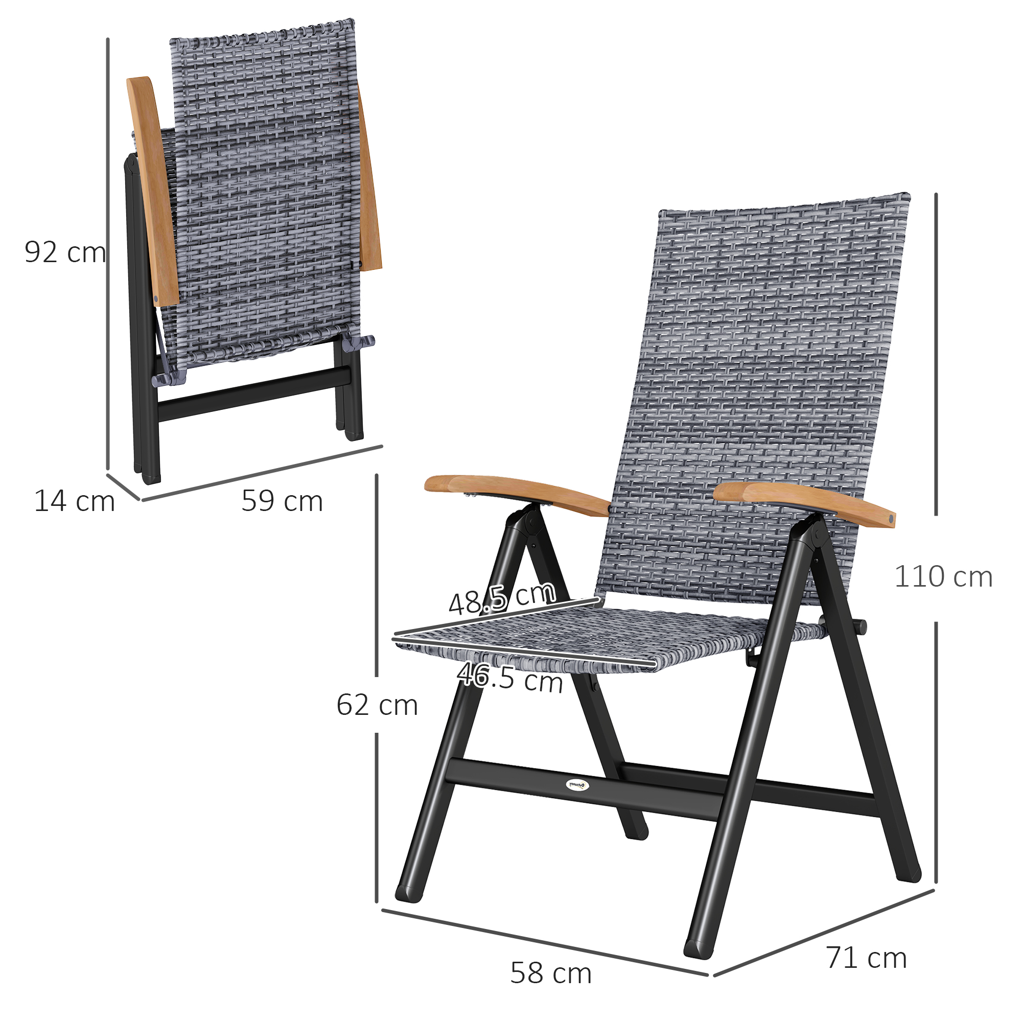 The seat for summer - this Outsunny rattan garden chair. With a powder coated steel frame, this rattan armchair has a strong and supportive core, for as long as you sit. Five-position adjustable backrest lets you relax at an optimal angle. Both the seat and back panel are made from plastic rattan: stylish, robust and keeps you seated properly in place. The wooden armrests allow you to hold your arms in a comfortable position. When done, simply fold away and store.