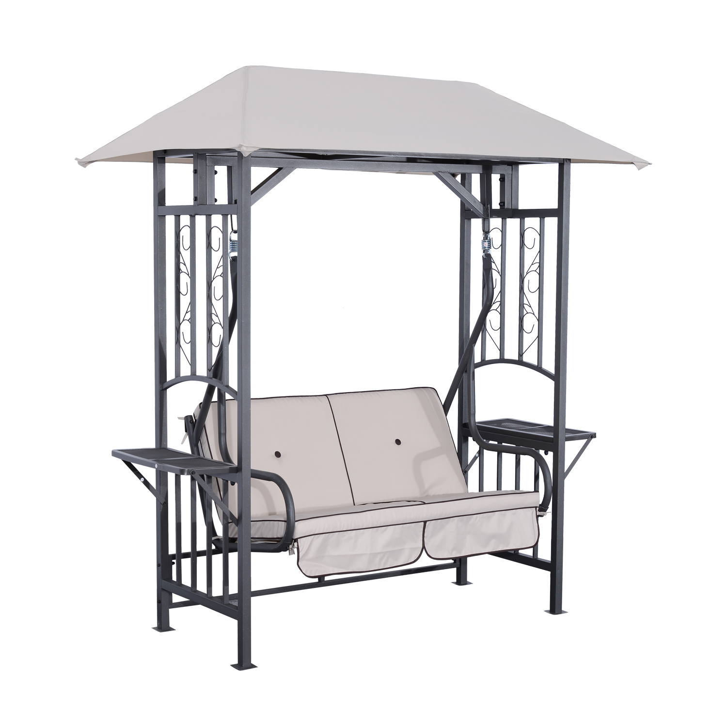 This Outsunny 2 seater swing chair is a great addition to any outdoor living space, design with a metal frame with a canopy the chairs hang from the frame to give you the swinging motion. It also features two side tables on either side to hold drinks and accessories. Made from a rust resistant metal frame for strength and stability, with a weight capacity of 180Kg. The canopy cover is made from polyester allowing for shade from sunlight and light rain. The seating has 8cm thick cushions for ultimate comfort. This is a great piece of furniture and will match any outdoor décor.