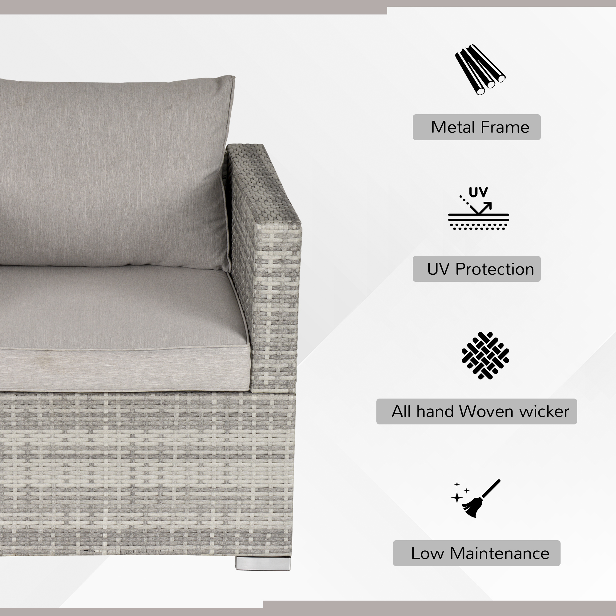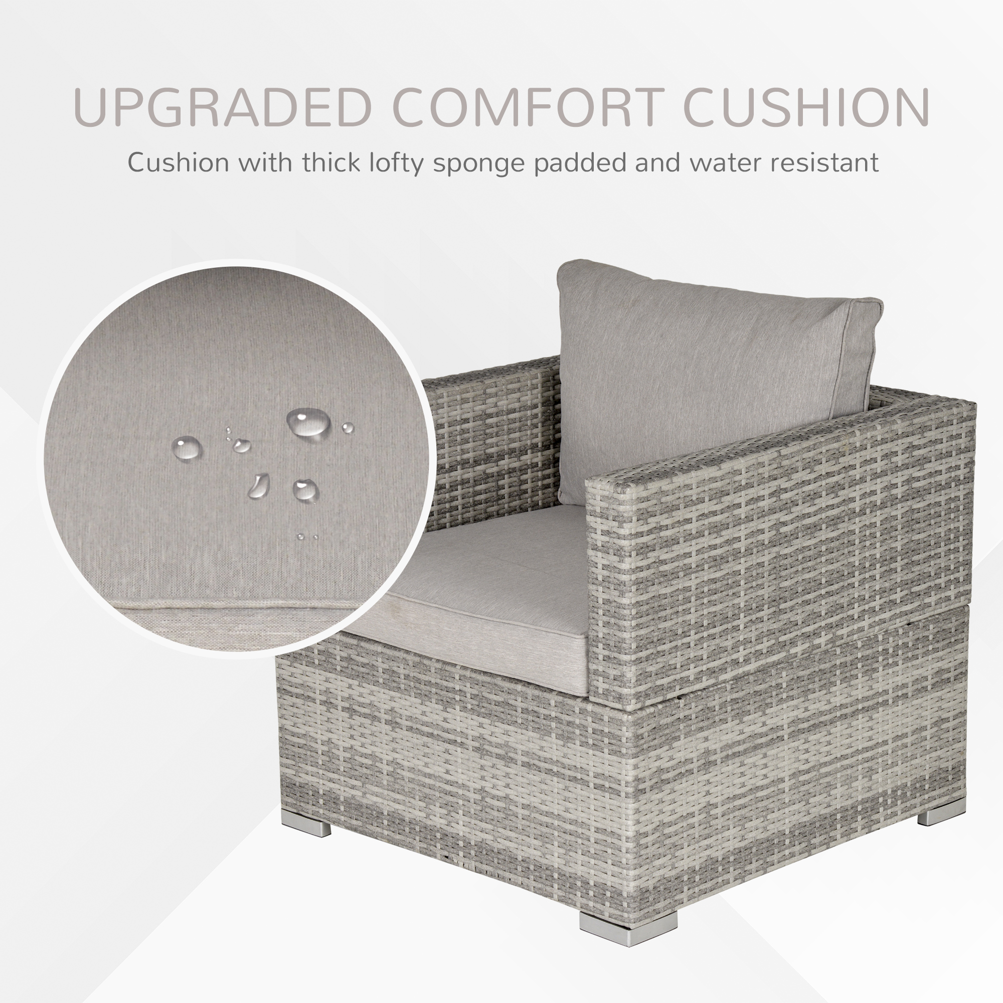 The comfy garden armchair from Outsunny. Made of steel frame to prevent rust and damage outdoors, wrapped in rattan for easy cleaning and is a mainstay in your garden furniture. Come with soft padded and plush cushions, as well as being water-resistant and having washable covers, with a high back and armrests for plenty of support—a great way to sit back and relax in the sun.