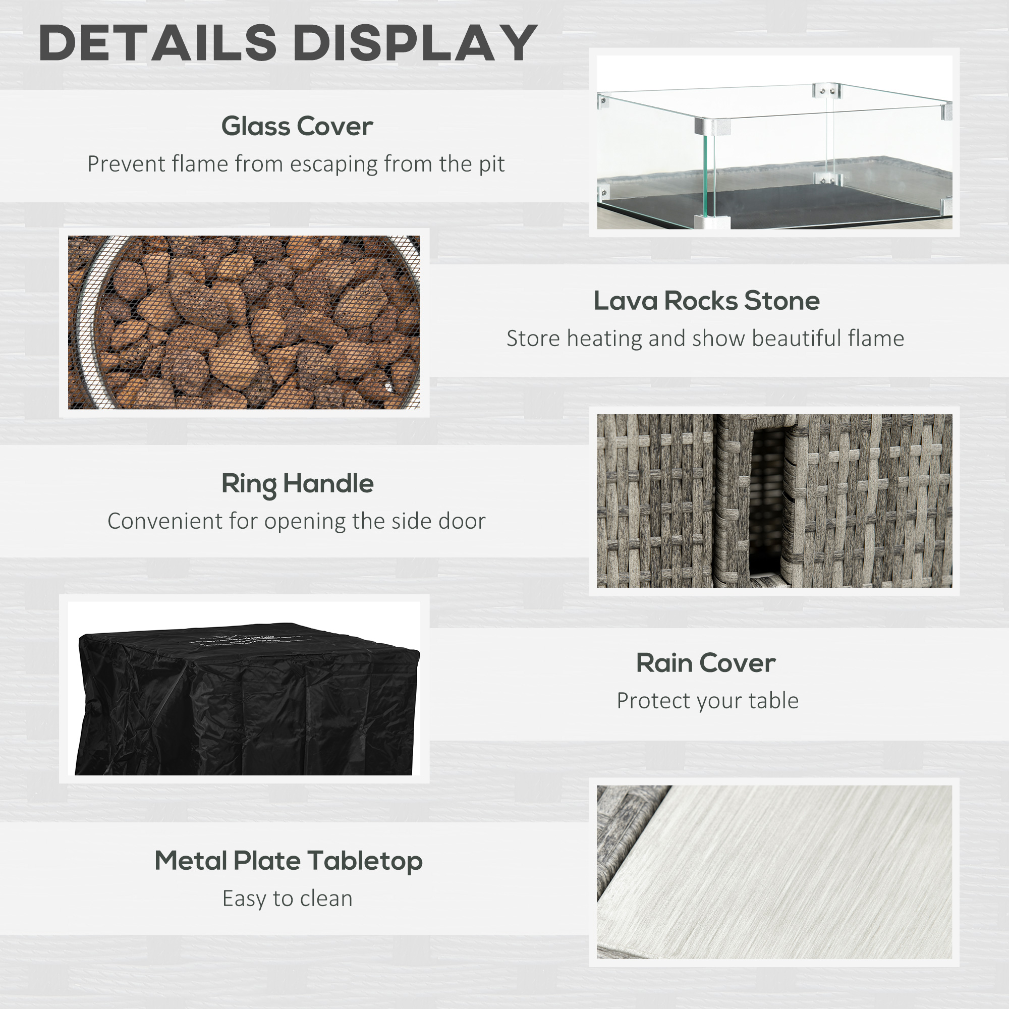 Enjoy garden warmth and ambiance all year-round with this Outsunny fire pit table. Rattan-effect design is stylish, looks great matched with other furniture. The tabletop is fitted with a centre fire pit - the 50,000 BTU burner is powerful and produces a clean smokeless burn. The flame can be adjusted too. The thermocouple closes the valve if the flame goes out for safety - no leaking gas. Complete with a glass guard, protecting against flying sparks.