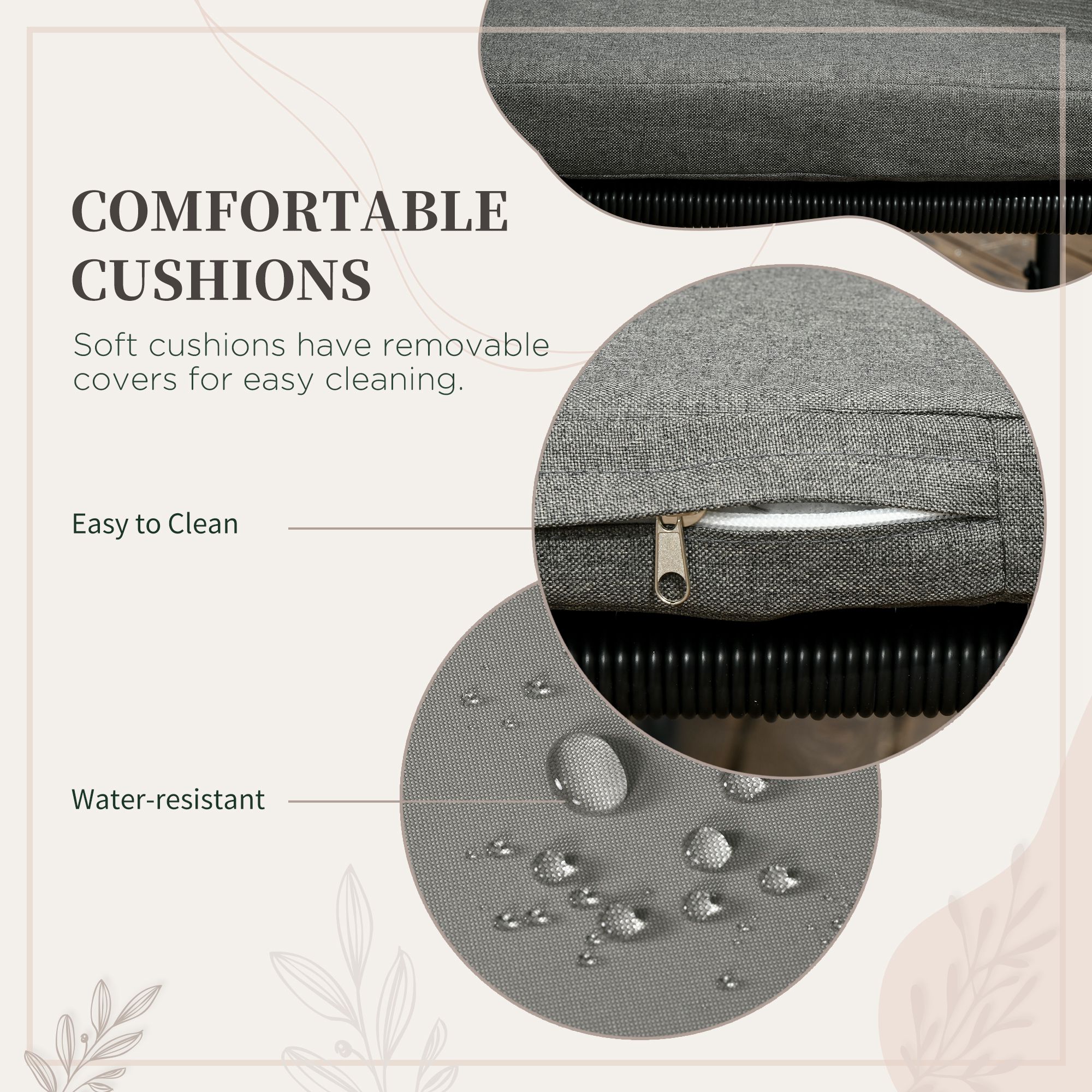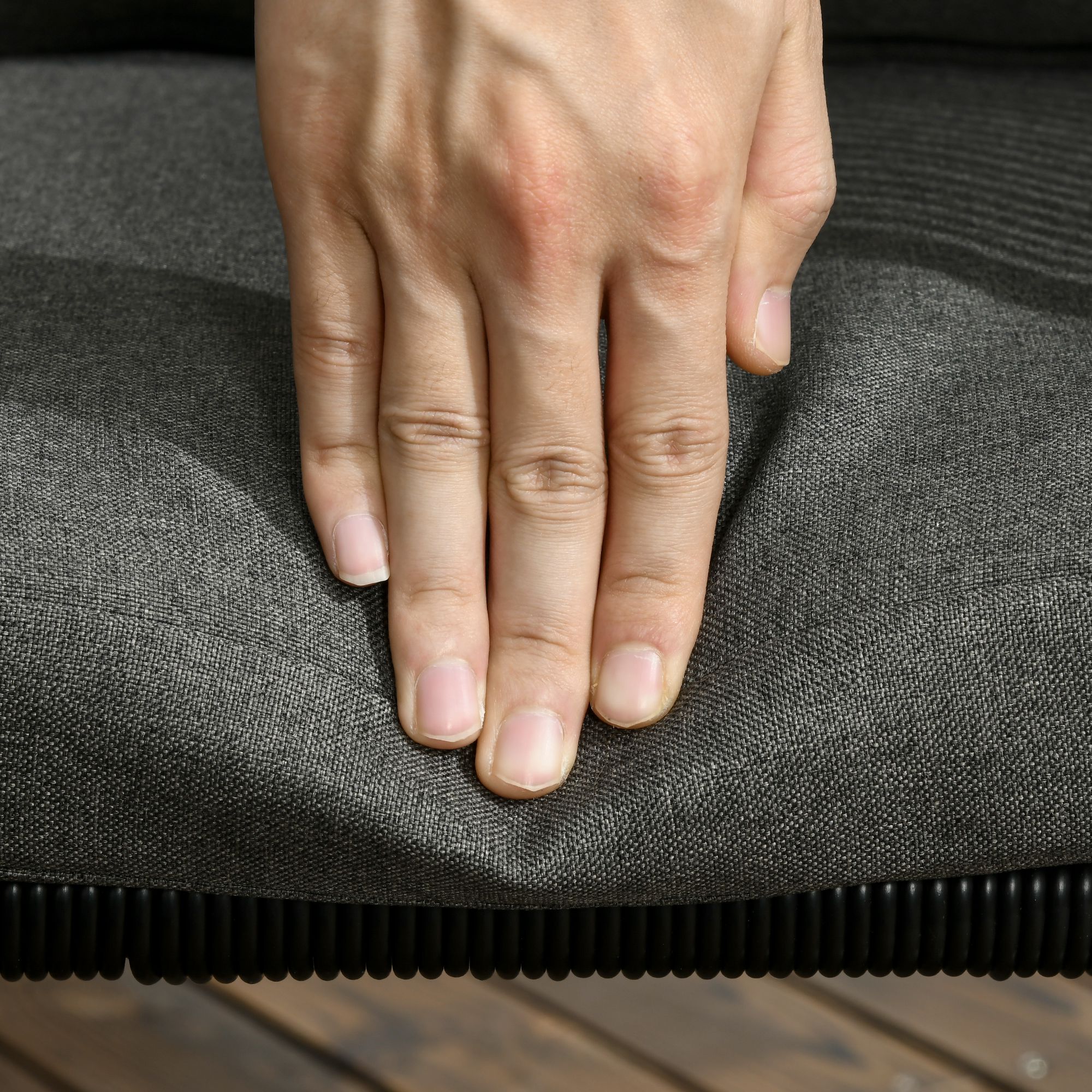 An inviting setting for all great for garden and other outdoor areas: this Outsunny five-piece garden set. It comes with four armchairs and a square dining table - room for you to sit down and gather round together. Solid metal for a strong frame, with plastic wicker for the chairs to offer double the durability; the fringed design creates a very cool look. The wood-effect plastic tabletop is tough and easy to clean. Both chairs and stools come with padded cushions for comfort.