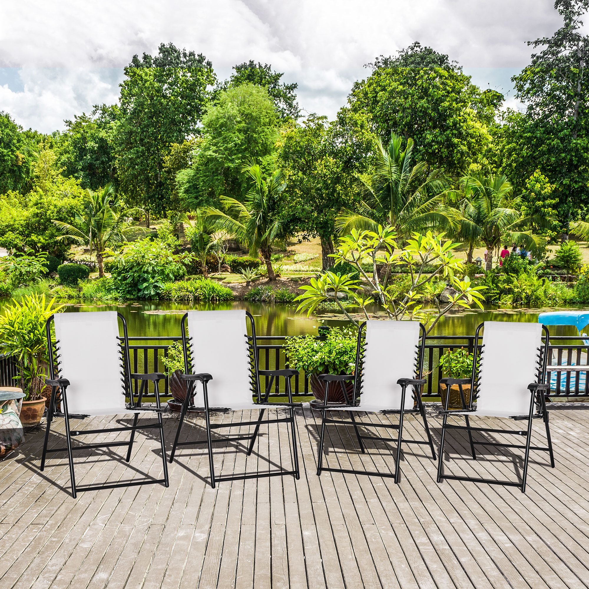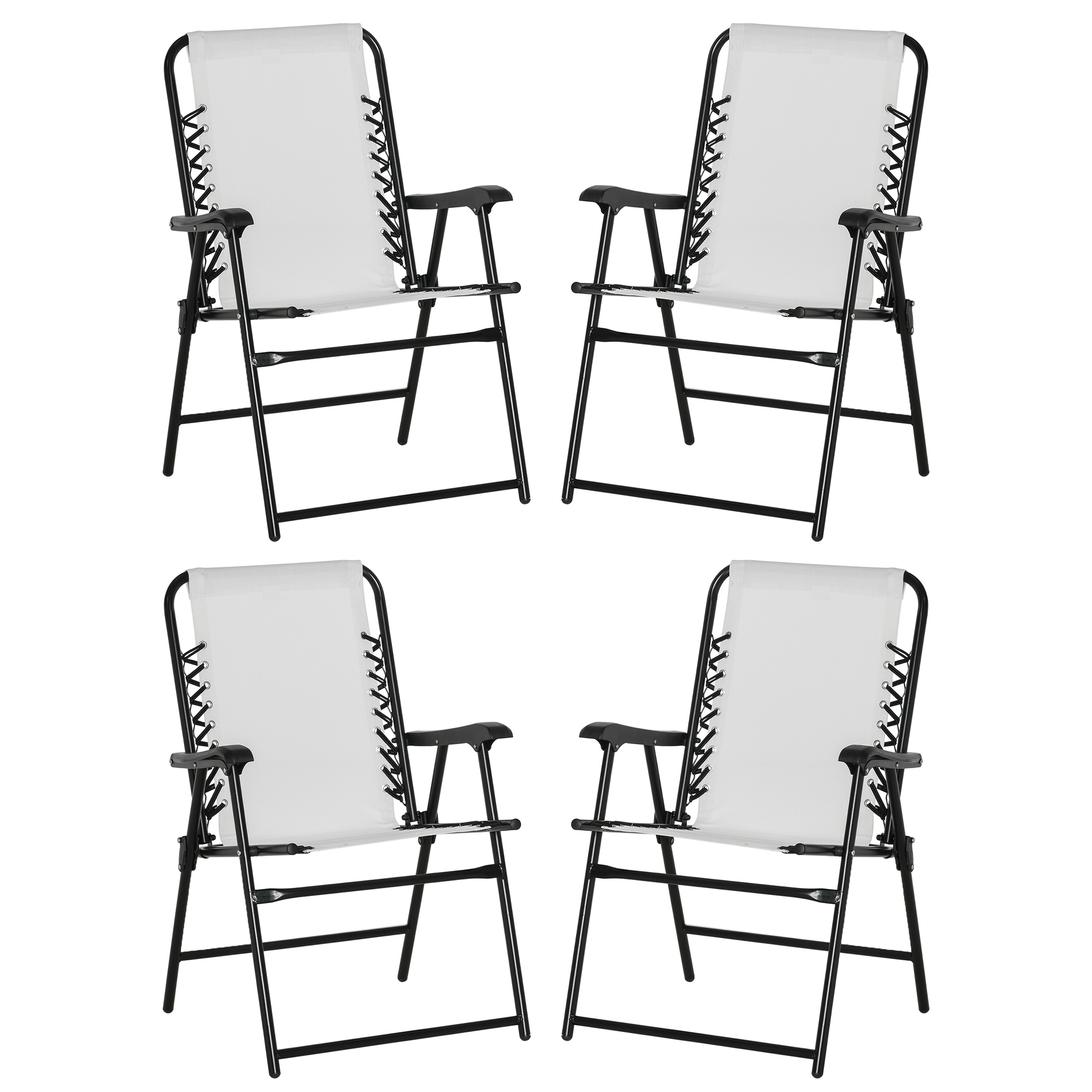 This four-piece outdoor folding chair set from Outsunny is great for any gathering, both indoor and outdoor. The garden chair frames are made from powder coated steel for a strong, supportive structure. Mesh fabric seat holds your body comfortably, the high back and armrests give you support. Lightweight and foldable, each chair is easy to carry and store. Spend no time assembling; sit back and relax!