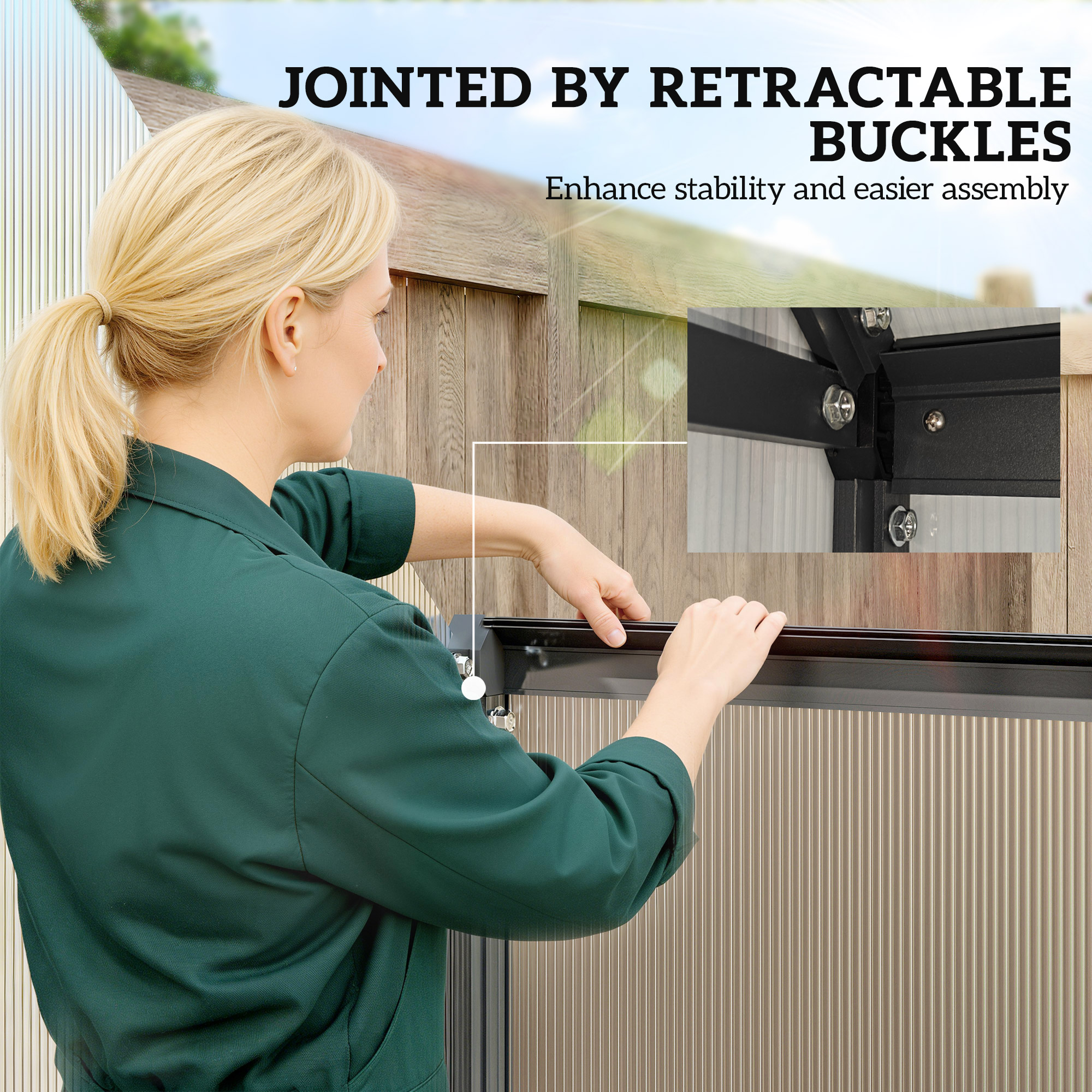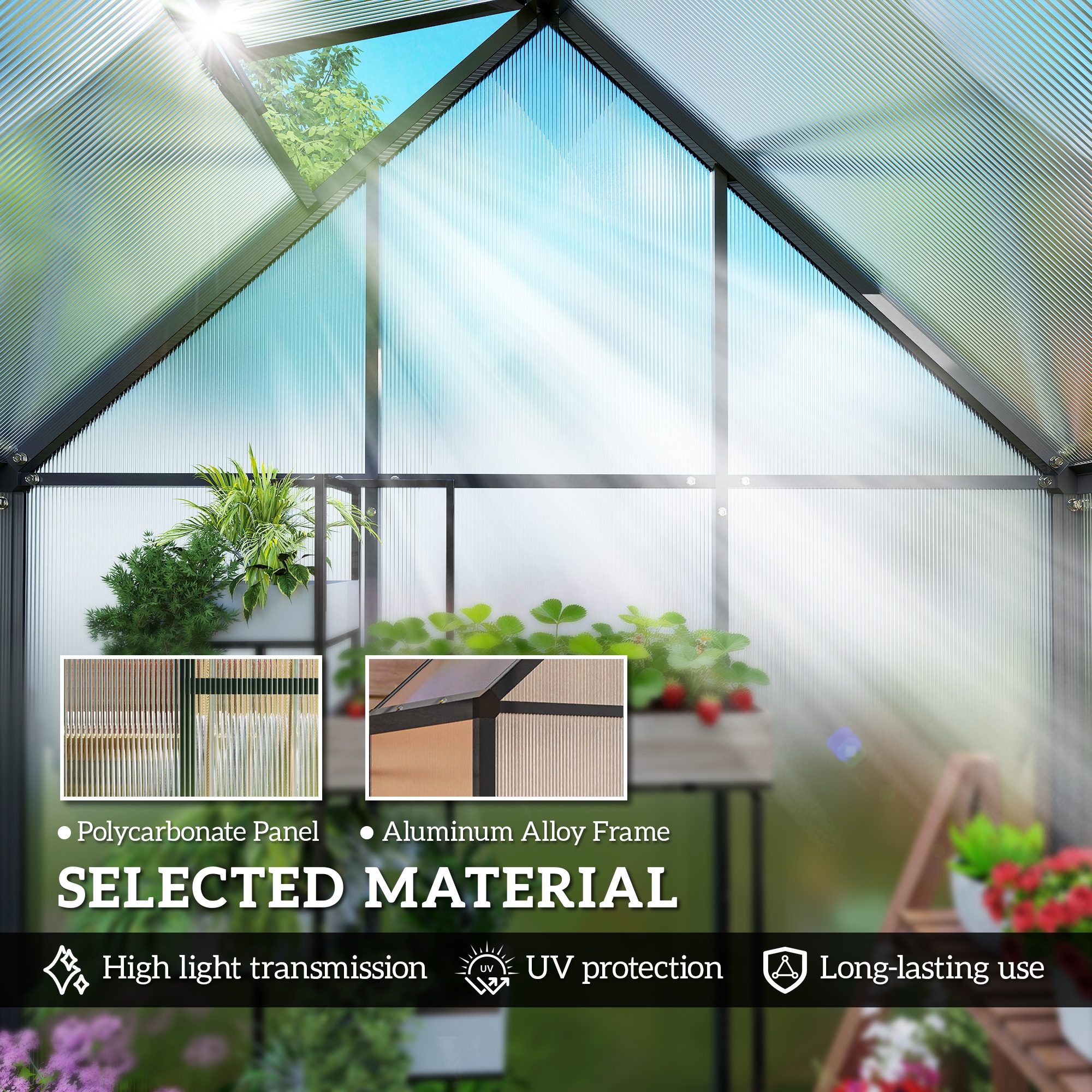 This outdoor greenhouse blends durability and functionality for thriving plants! Its rust-resistant aluminium frame jointed by retractable buckles offers enhanced stability and easier assembly. UV resistant polycarbonate panels allow light transmission while retaining heat. The swing door offers enhanced sealing and insulation. Adjustable window regulates temperature and airflow. This greenhouse is great for year-round gardening!