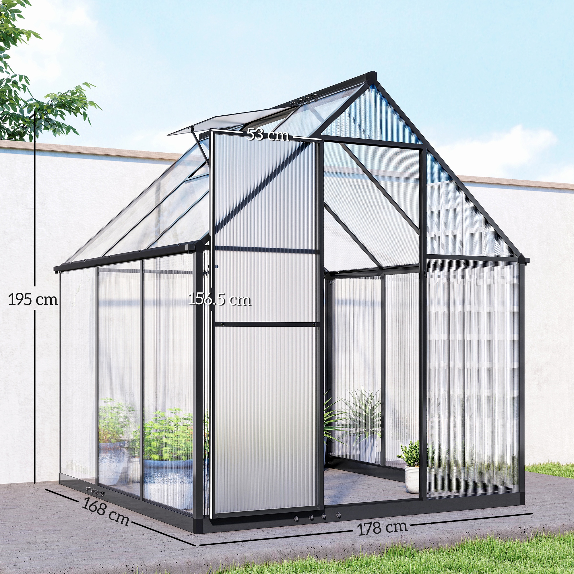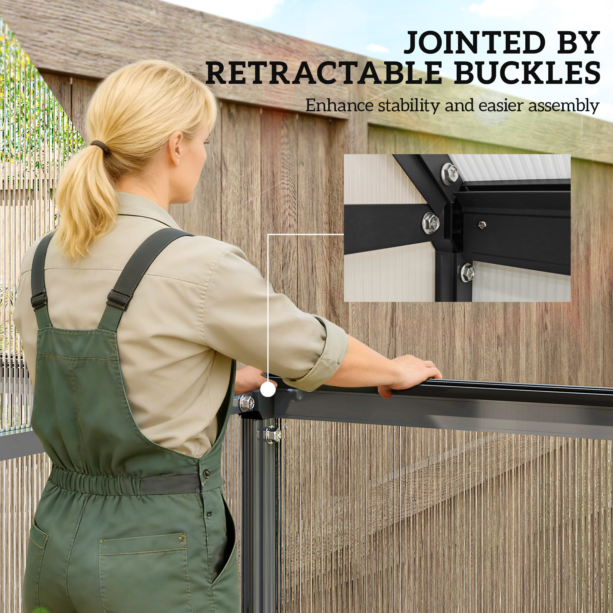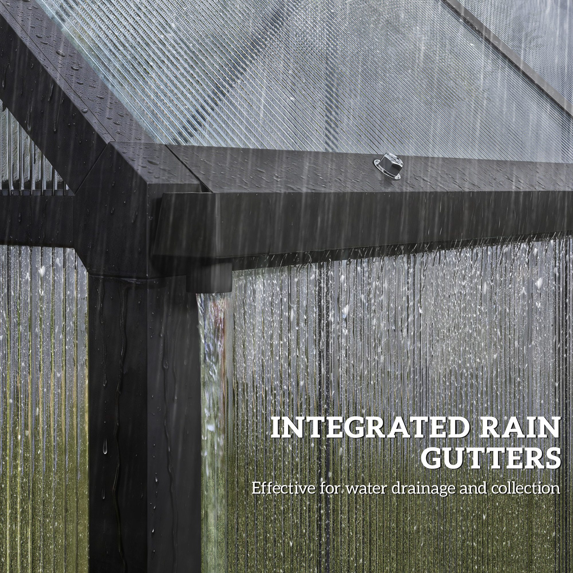 This outdoor greenhouse blends durability and functionality for thriving plants! Its rust-resistant aluminium frame jointed by retractable buckles offers enhanced stability and easier assembly. UV resistant polycarbonate panels allow light transmission while retaining heat. The swing door offers enhanced sealing and insulation. Adjustable window regulates temperature and airflow. A practical drainage system with a rain barrel enables plant irrigation—great for year-round gardening!