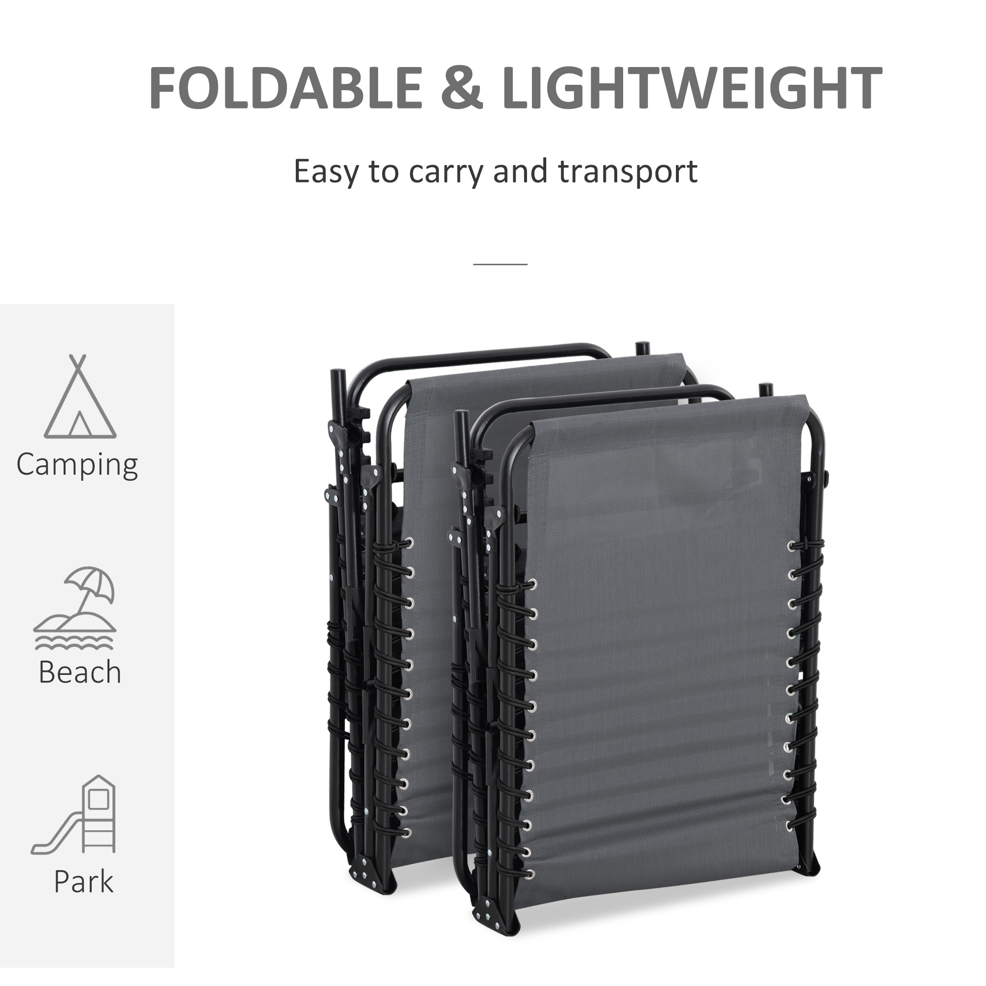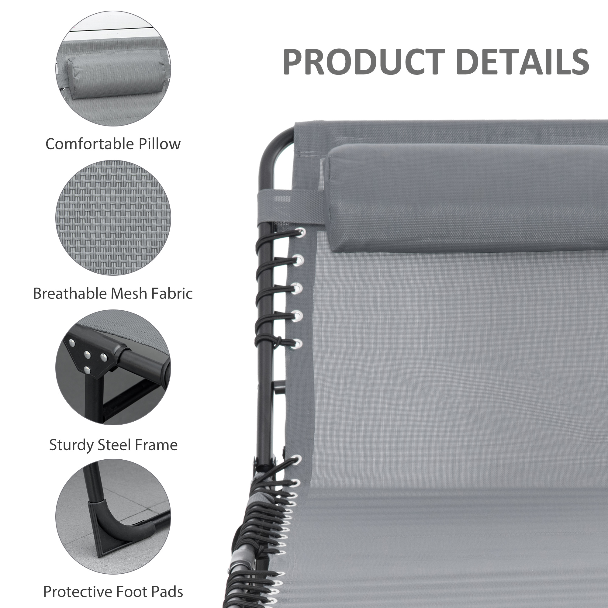 Lounge outdoors the classic way - go for this folding recliner from Outsunny. Sturdy steel frame supports up to 120kg. The back can be adjusted to five positions to relax at a position you want. There's a mesh fabric seat stretched on the frame to hold your body, with a removable pillow on the top to support your head/neck and keep it comfortable. Easily folded into a compact size, making it easy to carry and store. A perfect piece to put in your car for those weekend beach trips.