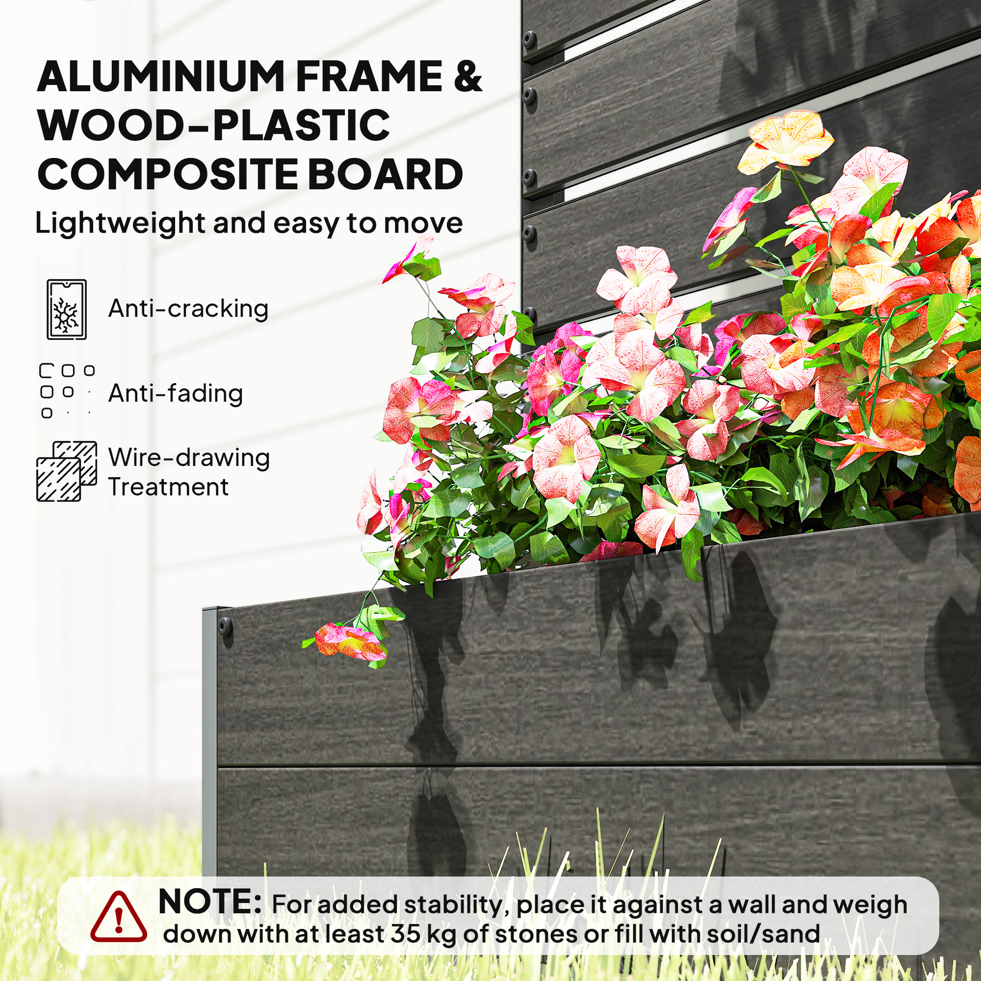 This Outsunny garden planter does more: it comes with a slat trellis back for climbing plants and vines - and even doubles as a privacy screen, making it suitable for balconies, patios or any outdoor space where a little seclusion is welcome. An aluminium frame ensures a strong structure, fitted with wood-plastic boards that are weather-resistant. The outdoor planter is built to last, offering a versatile and thriving garden space - with both function and style - wherever you place it.