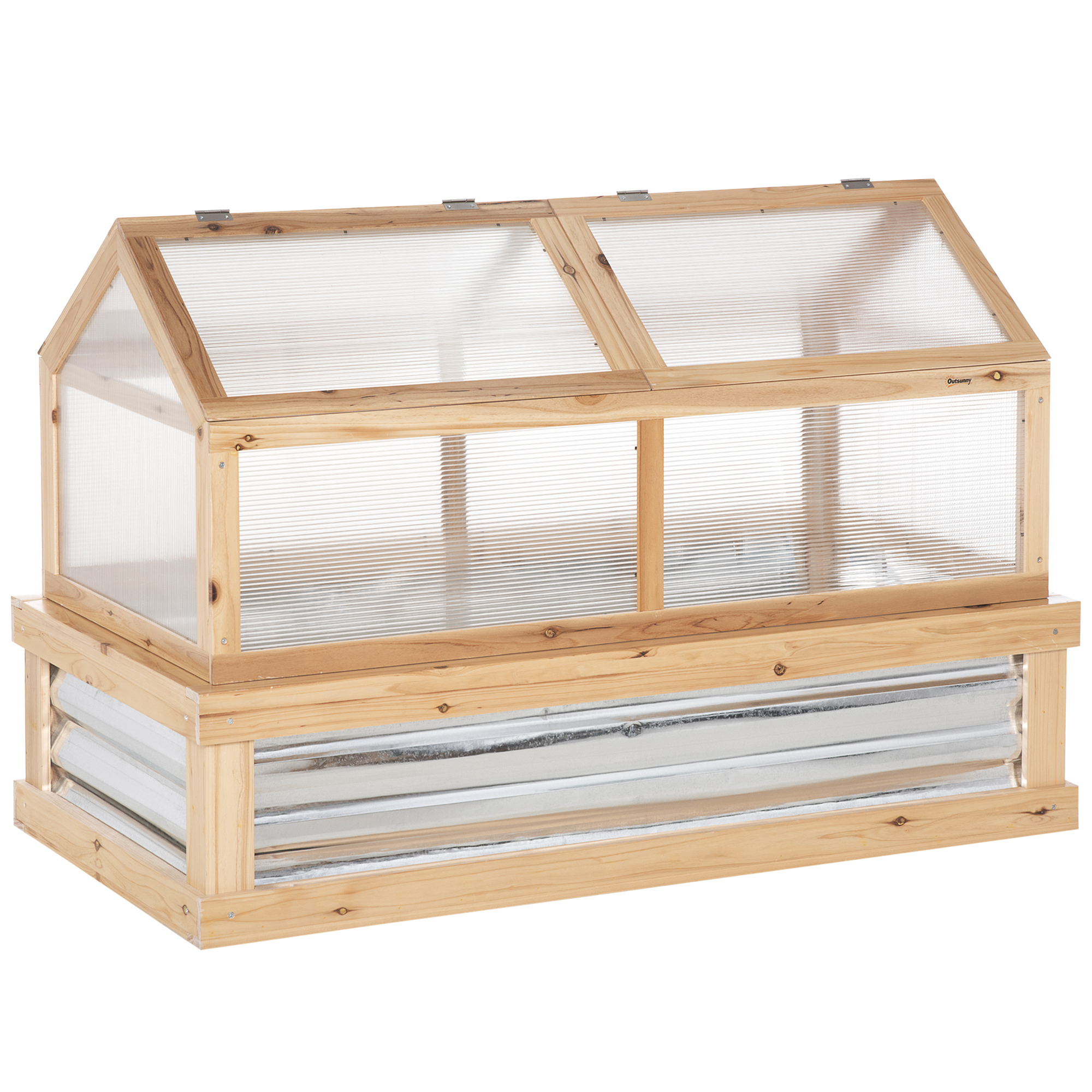 This Outsunny two-part greenhouse gives you double the room to grow plants to their best. 1) The top cold frame gives plants, flowers and more a safe shelter thanks to the polycarbonate panels, protecting from light weather whilst allowing sunlight through. 2) the bottom half provides open display, with the metal lining helping to attract and trap heat inside to promote growth. Whether your growing space is compact or generous, you can grow with this handy wooden frame.