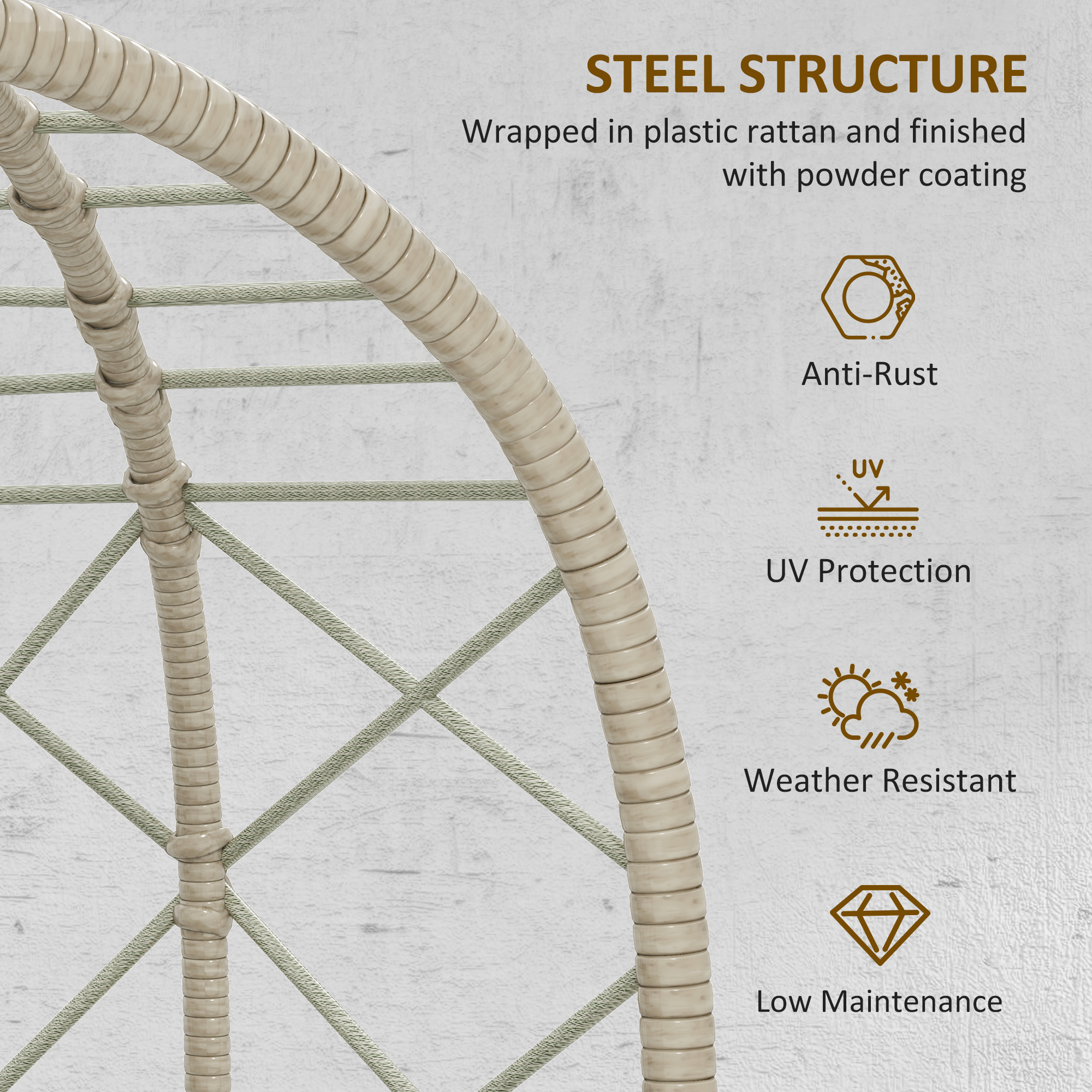 Relax in optimal comfort with this outdoor standing egg chair from Outsunny! This rattan garden chair with a rope woven hollow-out design is like a cosy bird-nest retreat. 20cm thickened cushion and a separate head pillow offer luxurious comfort. A steel frame means a strong, supportive core, whilst the outer plastic rattan wicker offers a stylish and protective top. Complete with a side cup holder for keeping drink within reach.