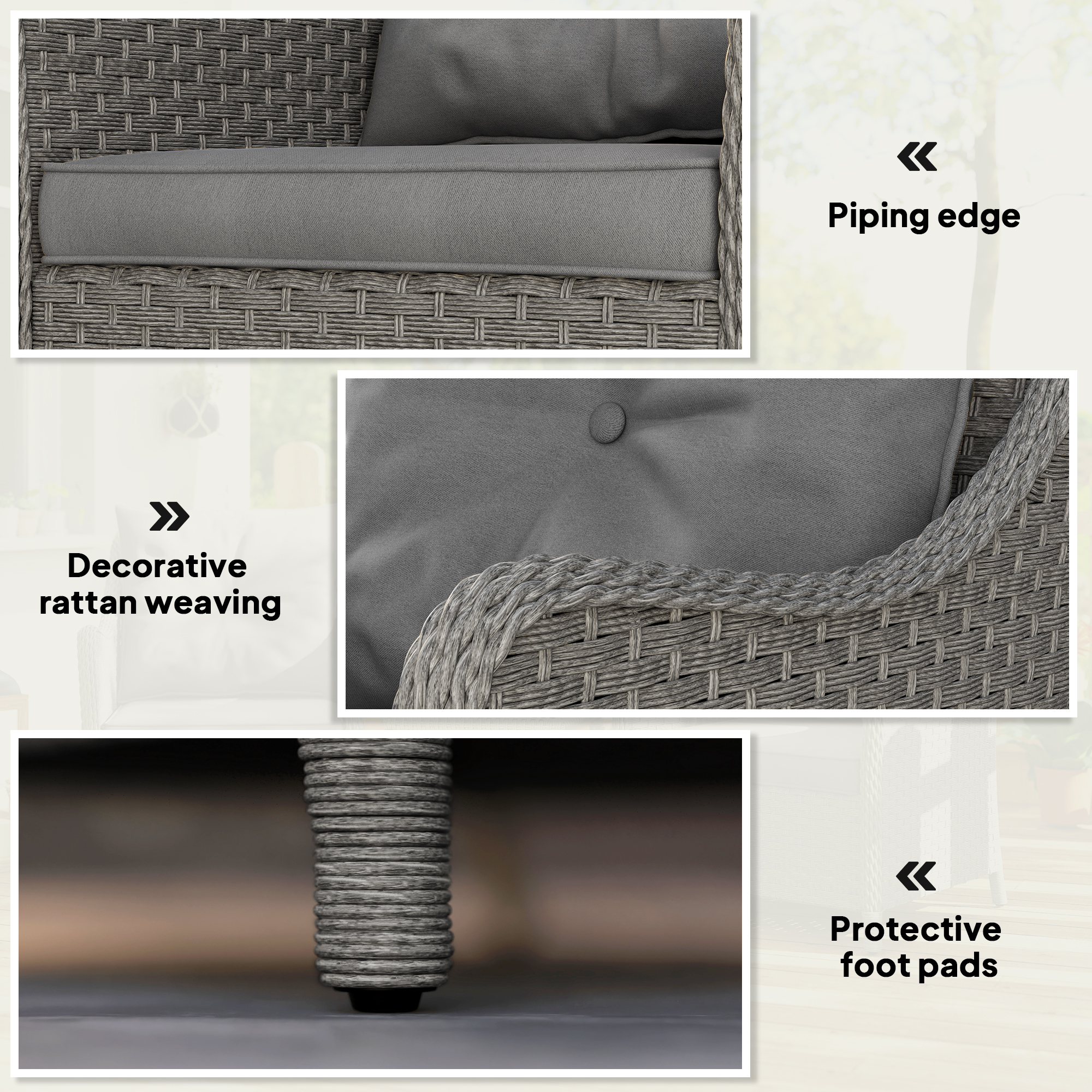 - Material: Steel, PE Rattan, Fibre Cloth (100 % Polyester), Sponge, Tiled Cotton, PP Cotton