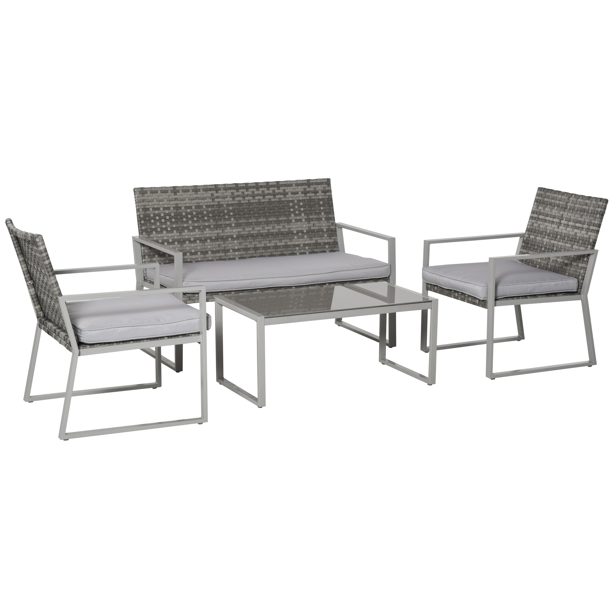 - Four-piece set, includes two wide chairs, a two-seat sofa and large coffee table
