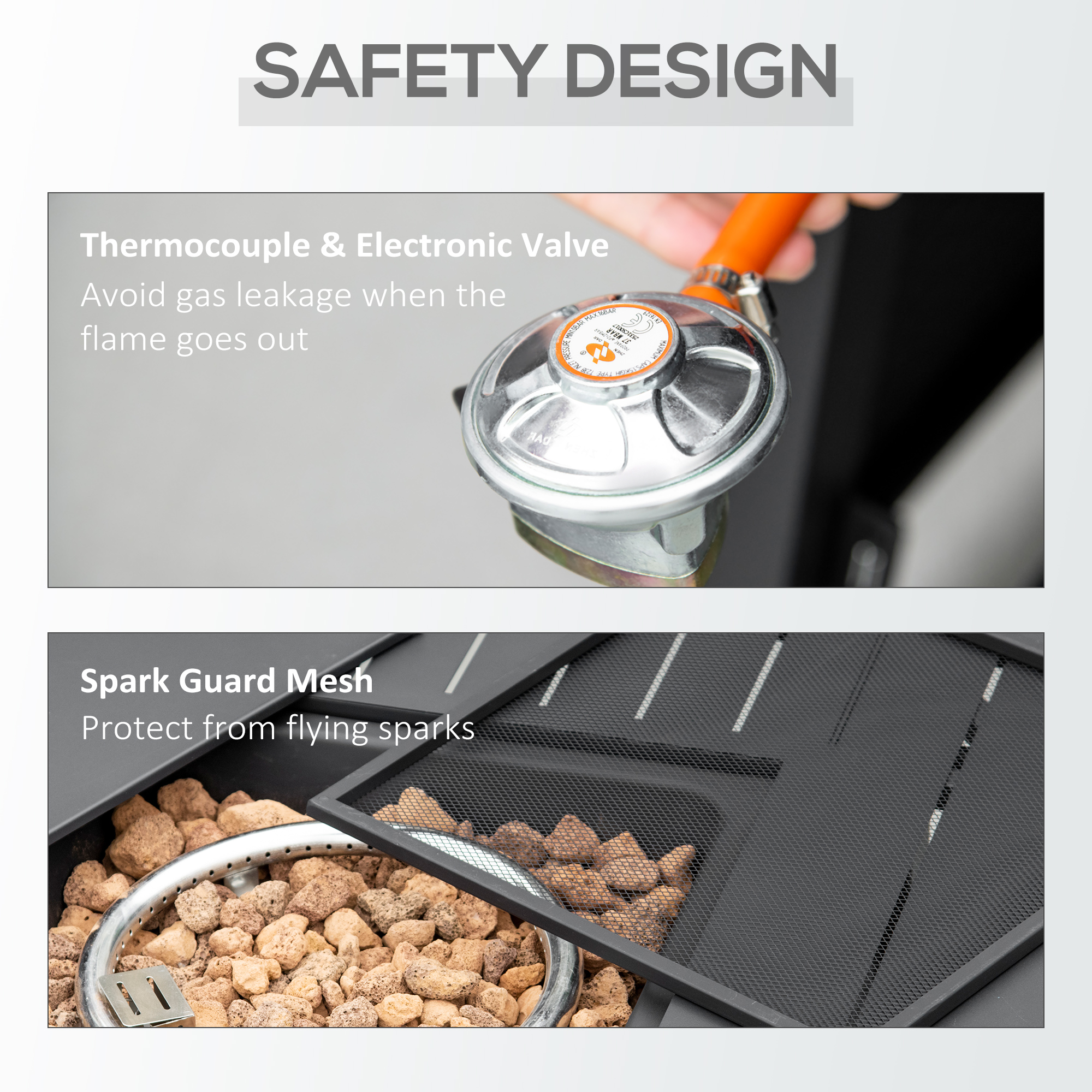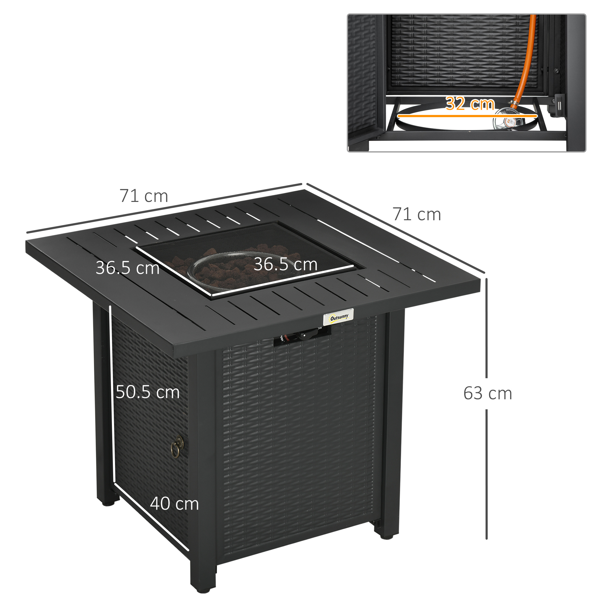 Enjoy garden warmth and ambiance all year-round with this Outsunny fire pit table. Rattan-effect design is stylish, looks great matched with other furniture. The tabletop is fitted with a centre fire pit - the 40,000 BTU burner is powerful and produces a clean smokeless burn. The flame can be adjusted too. The thermocouple closes the valve if the flame goes out for safety - no leaking gas. Complete with a mesh guard, protecting against flying sparks.
