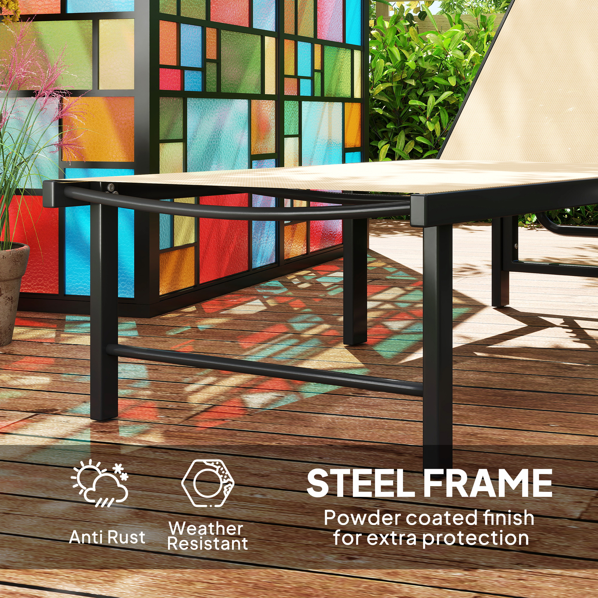 Lay the day away with your favourite way - grab this Outsunny garden sun lounger. The backs of the reclining sun lounger can be set to five different positions - lie back to a position you want. The breathable texteline seat panels hold you comfortably and keep you cool. The powder coated steel frames mean a strong, supportive core.