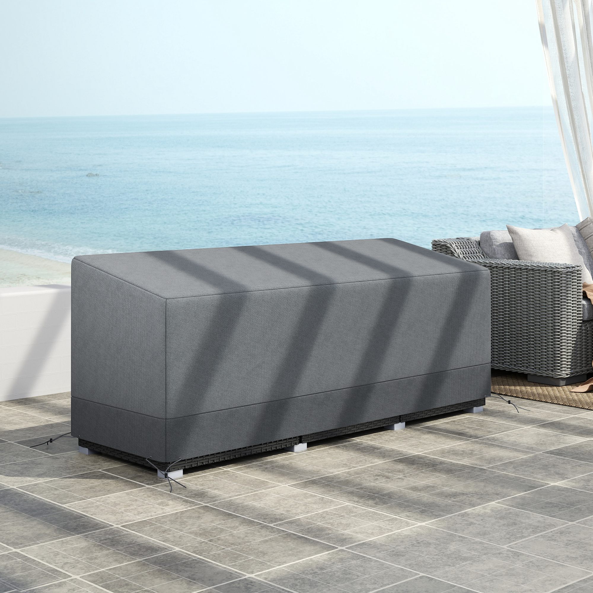Protect your outdoor furniture in all weather conditions with this rattan corner sofa cover from Outsunny. Made of high-density 600D Oxford fabric, it features a PE coating which protects against mild water and UV seeping through and causing damage. The lightweight outdoor table cover is easy to put on and take, cutting out any struggle. Finished with pull cord fastenings for a tight and secure fit.
