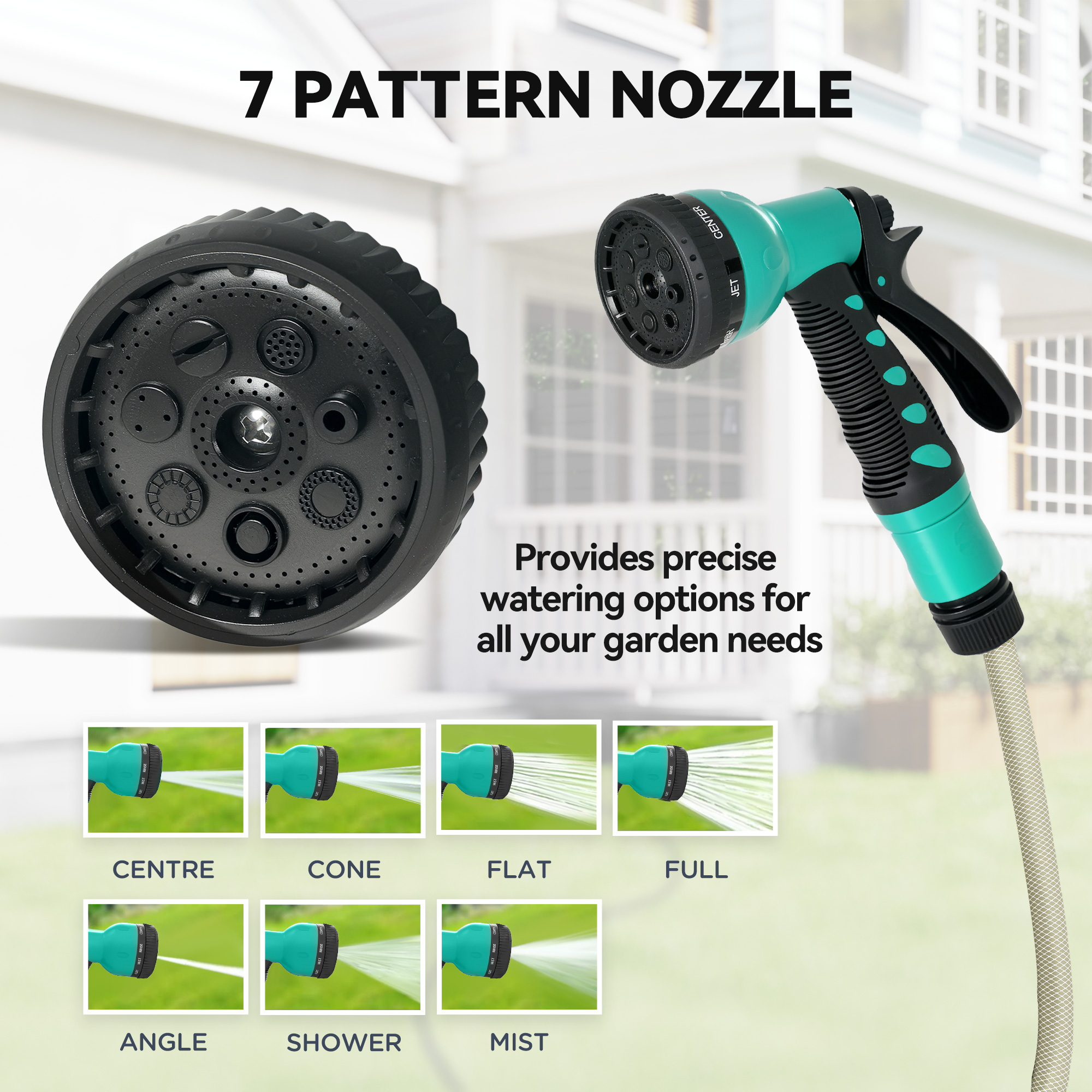 - Seven watering patterns cater to varied gardening needs